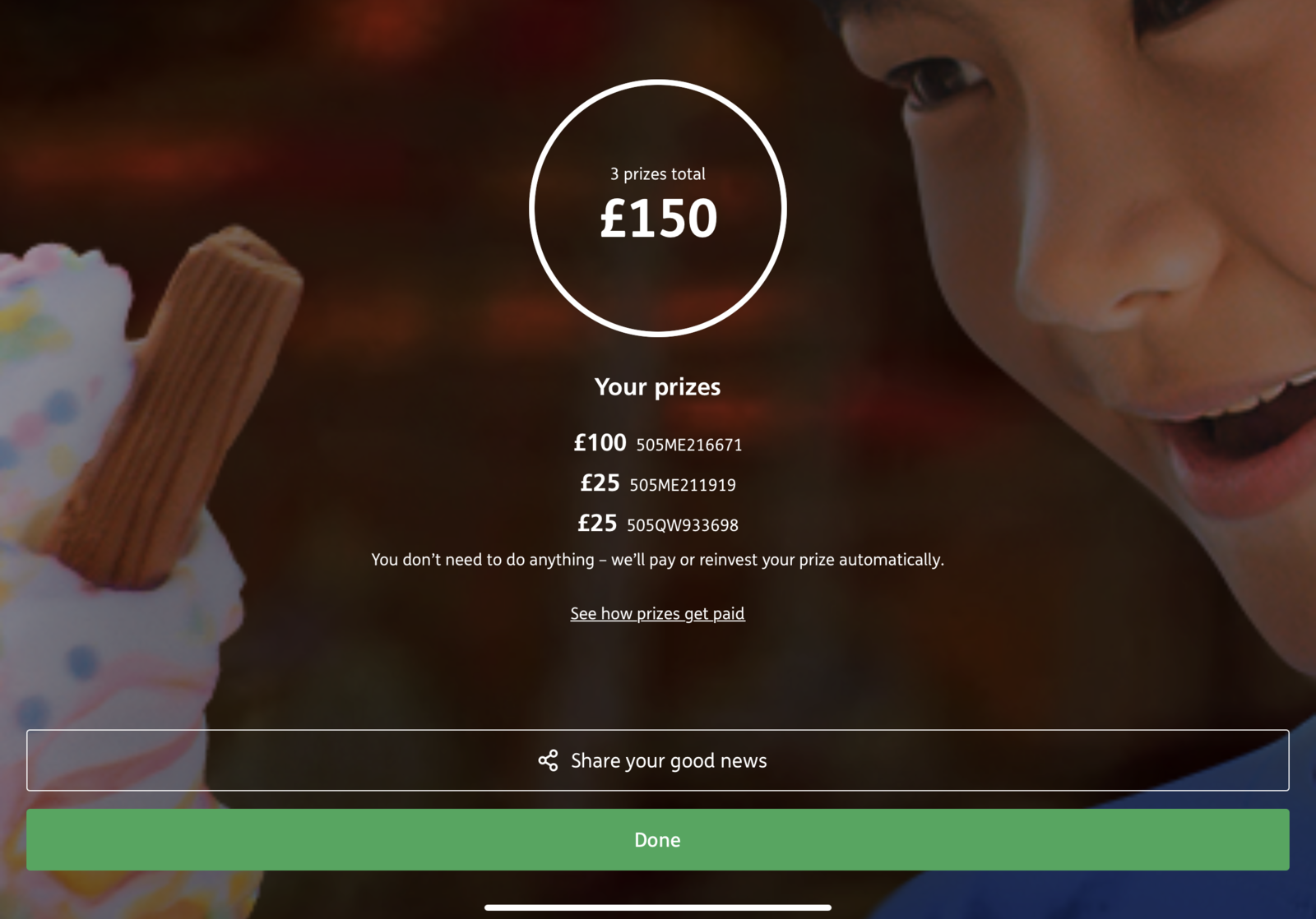 However, not long after we cashed in, we had an unexpected lump sum come back to us when her brother repaid both us and her sister back some money he had borrowed four years ago, so….we bought more bonds! We now have just under £19k in bonds. With our 'fresh' bonds, we have just had this win which is more than we had ever won before when we had the maximum holding: