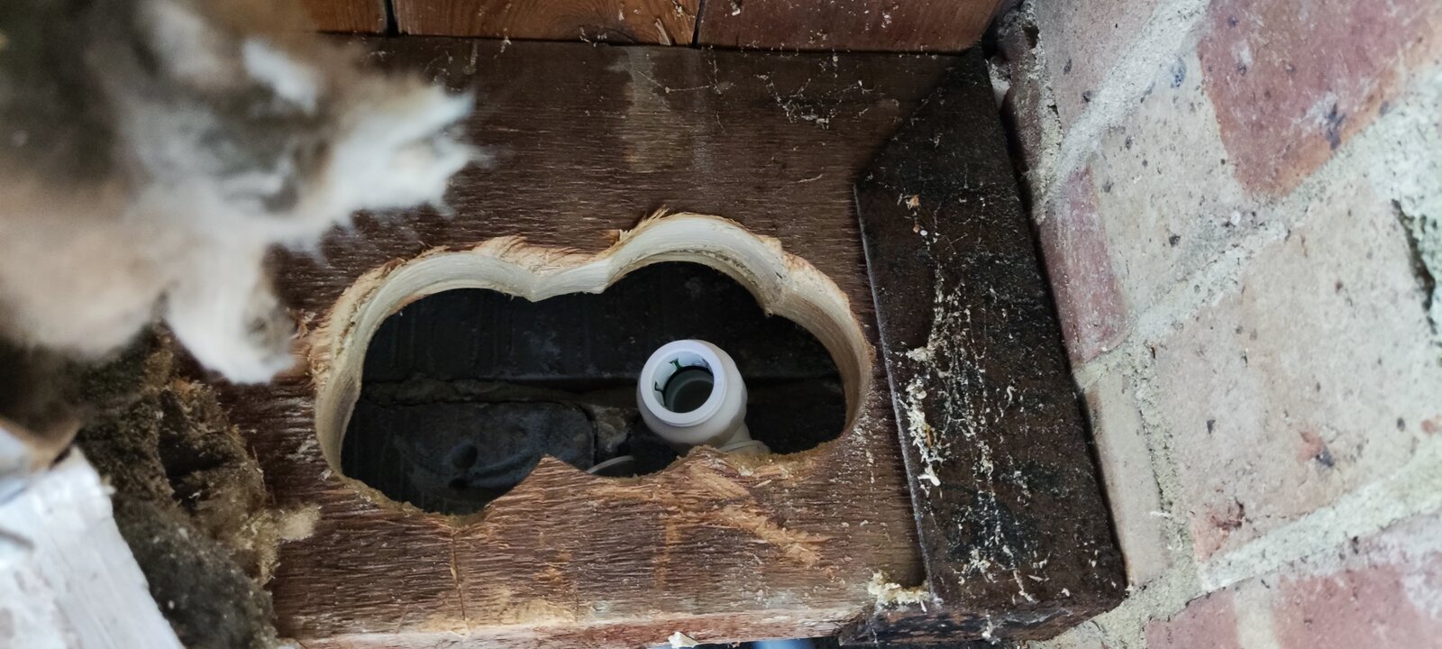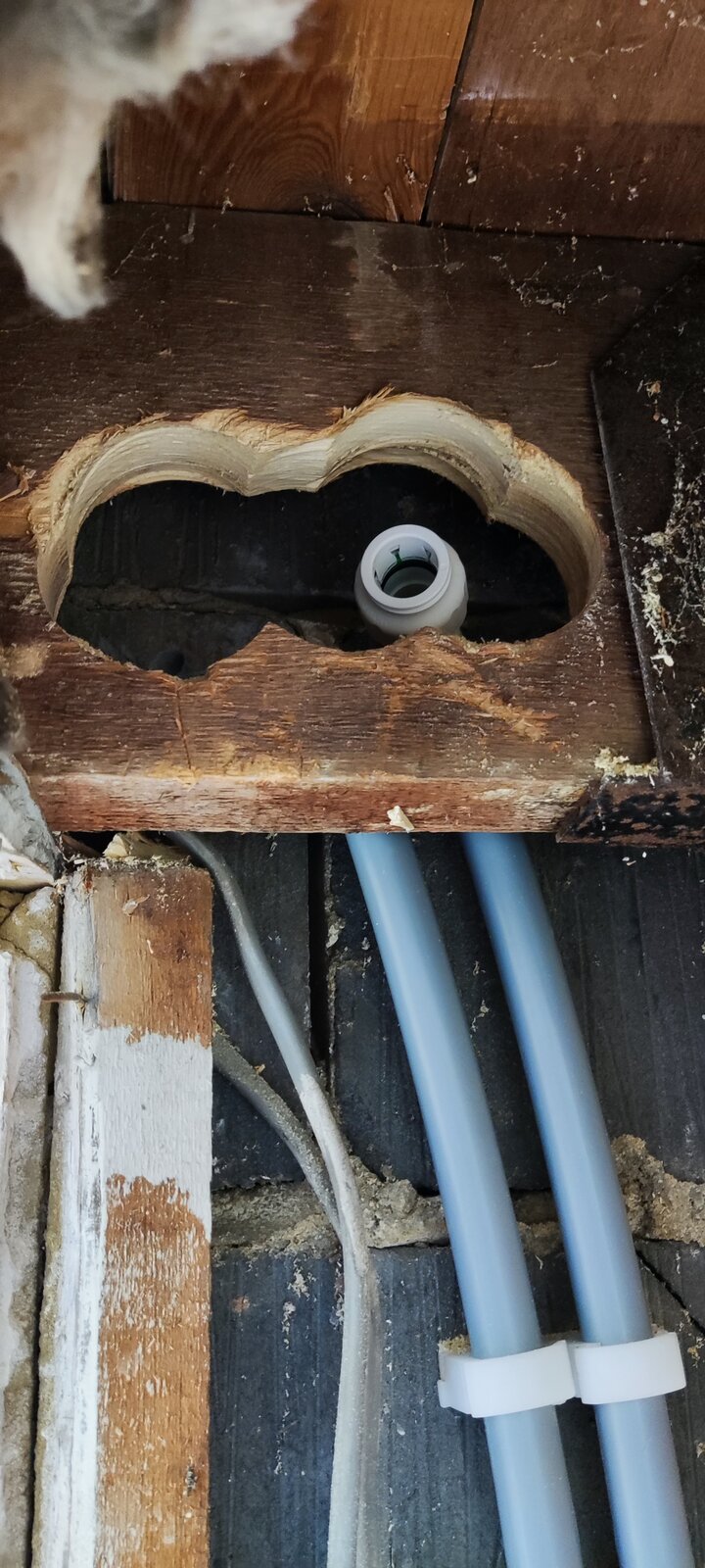 My heating engineer has drilled massive holes through a ceiling joist of the 1st floor of a 2 storey townhouse to make way for new central heating pipes. He is still working on them.