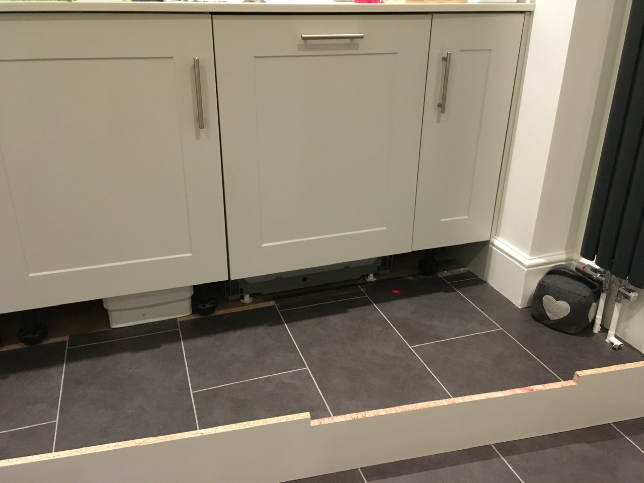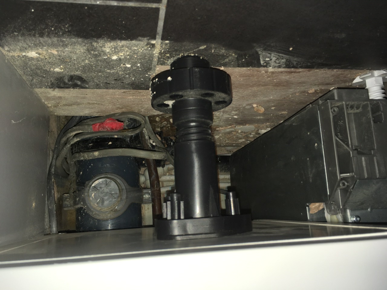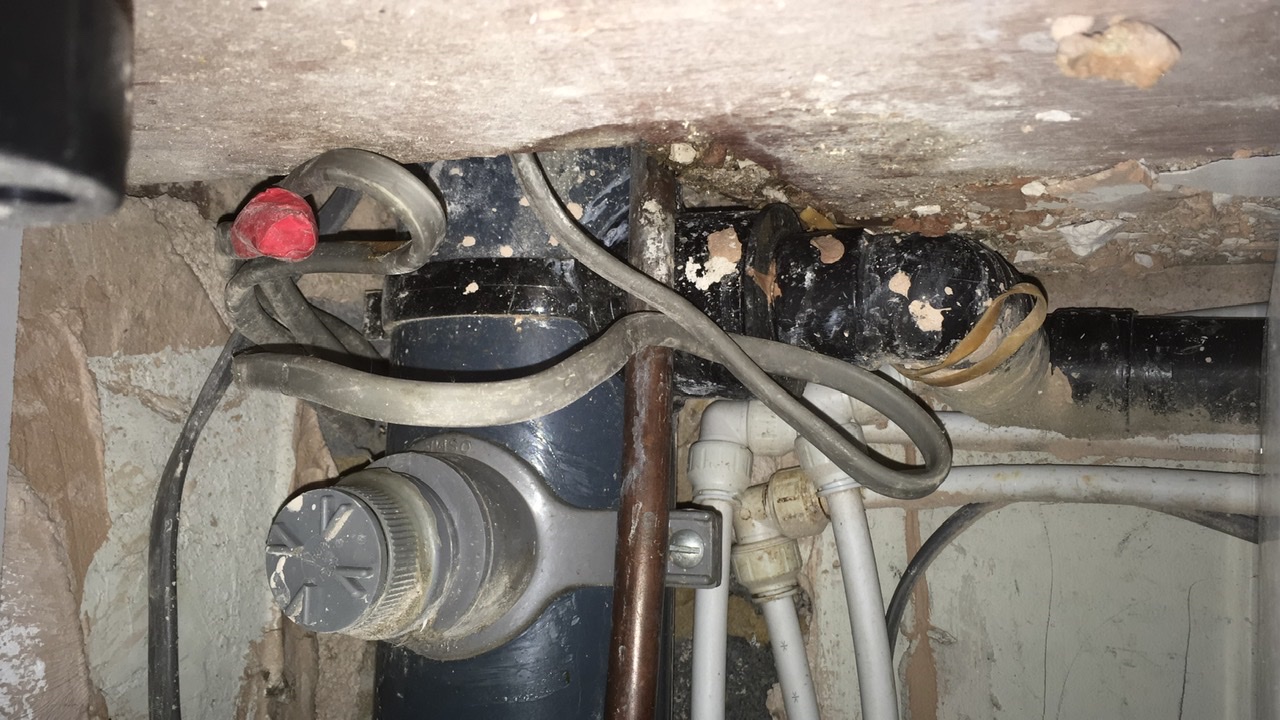 The dilemma is this: the pipe enters the floor towards the back corner of the room under the cupboards. I can’t easily get to it.