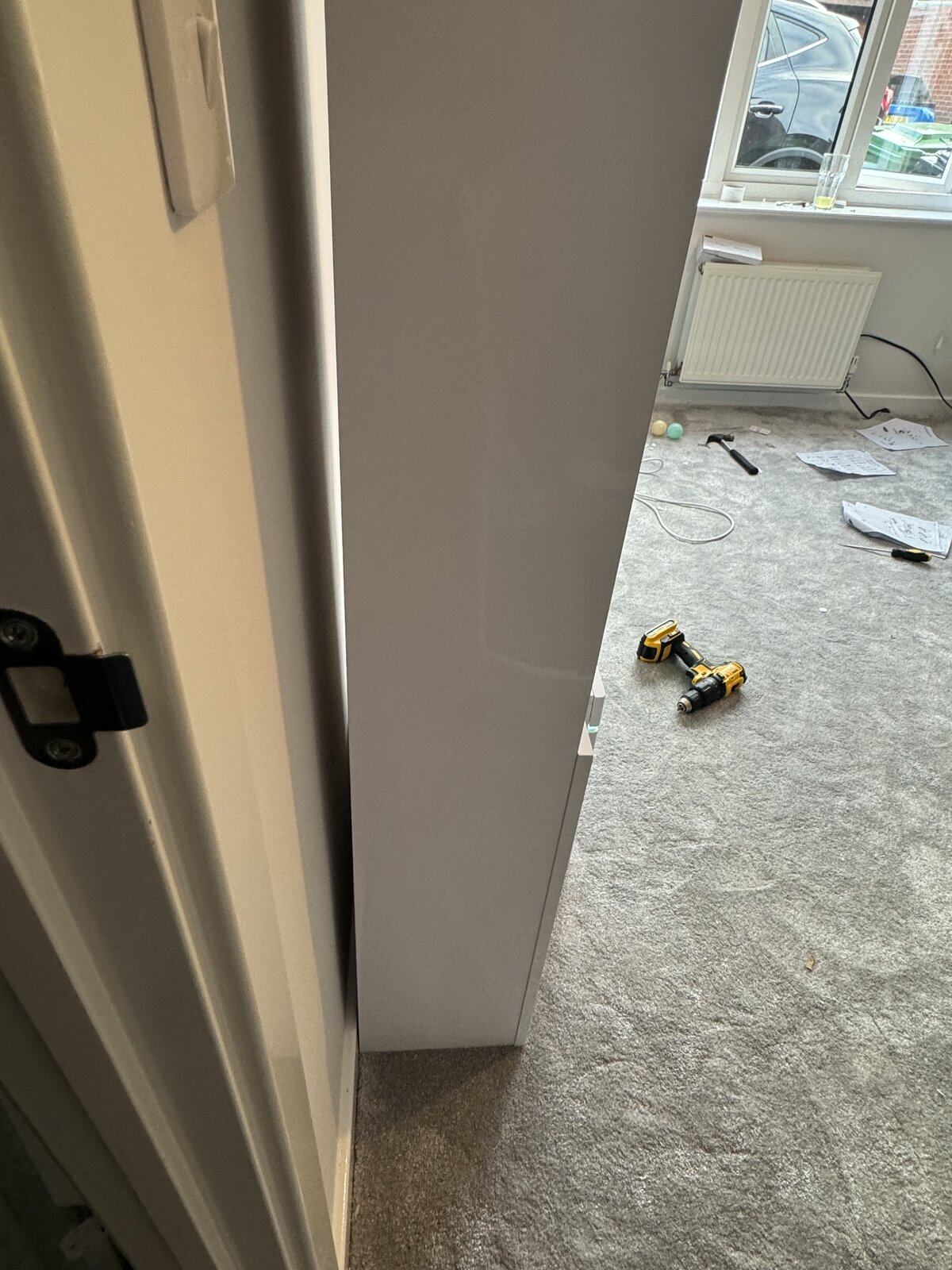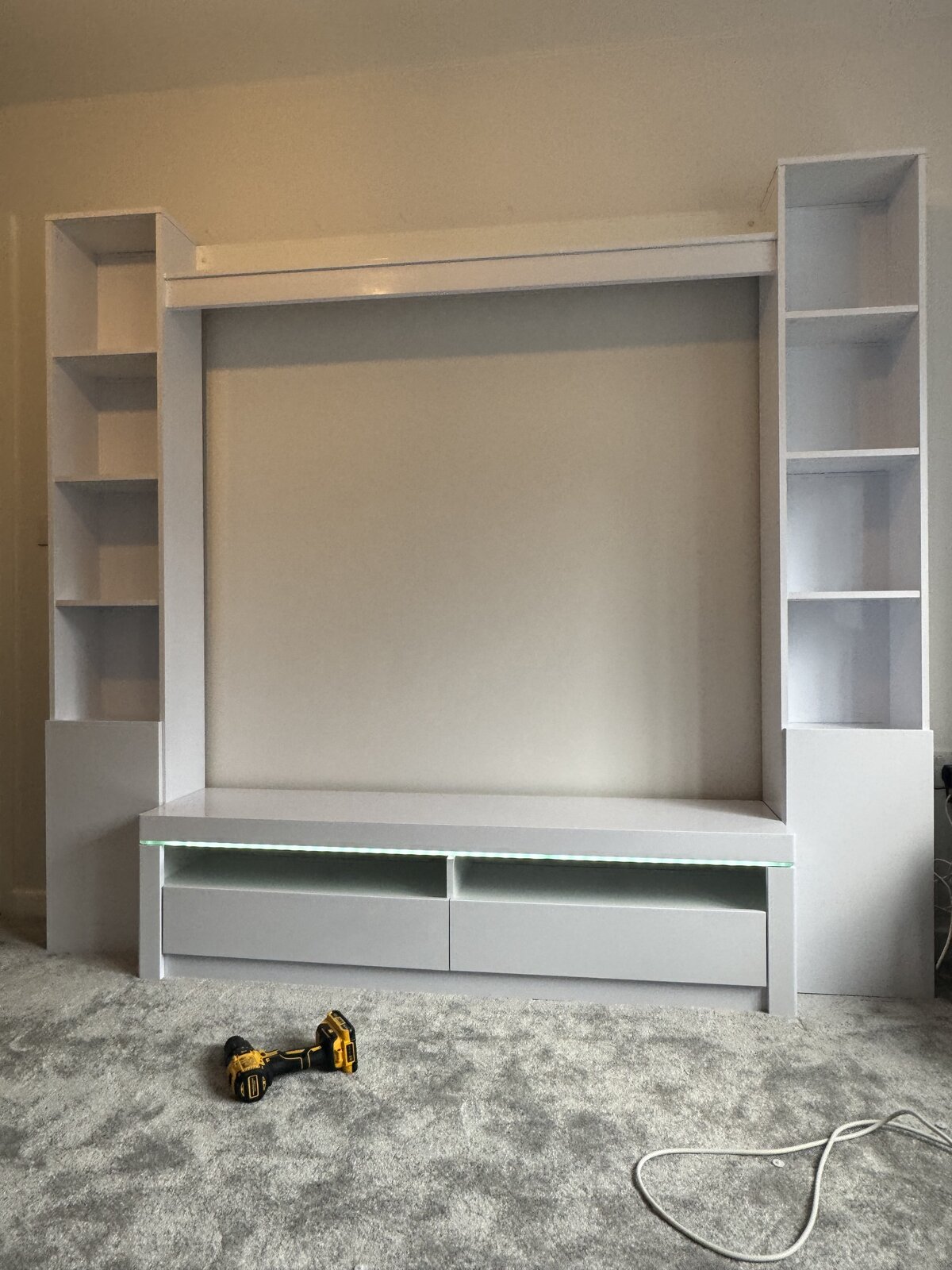 I want this media wall that I’ve just assembled to sit flush against the wall. At the moment the skirting board is preventing that. What’s the best way to solve this?