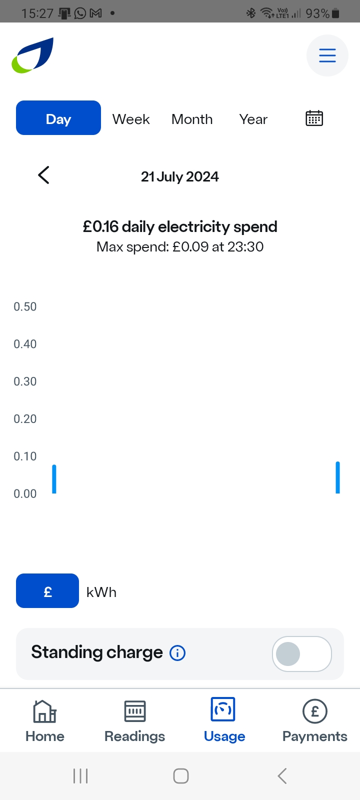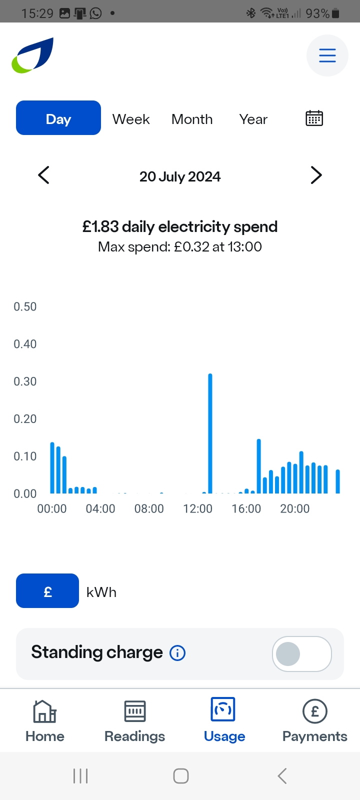 The peak was when I had a shower, but the software seems to smooth out some spikes, as it is not showing the 3 kW when making coffee, and have made 3 cups of coffee today. For a year now I have been moving my energy monitor around hunting for why background is so high, we have had power cuts, so any computer would have closed down, so two printers on line, one inkjet, one laser, there are SkyQ boxes, the router, three hubs, clocks, including smart central heating control, but these should be no more than one watt each, 4 TV's the same.