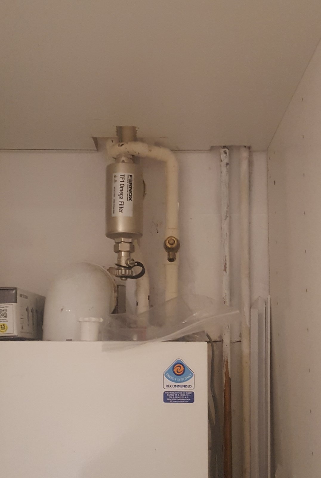 2- (see Picture) Directly above the boiler break into the 22mm feed and return pipes- I fitted a Fernox T1 Filter to the return pipe and so can use that as point of access, and on the feed side break in below the drain off point.