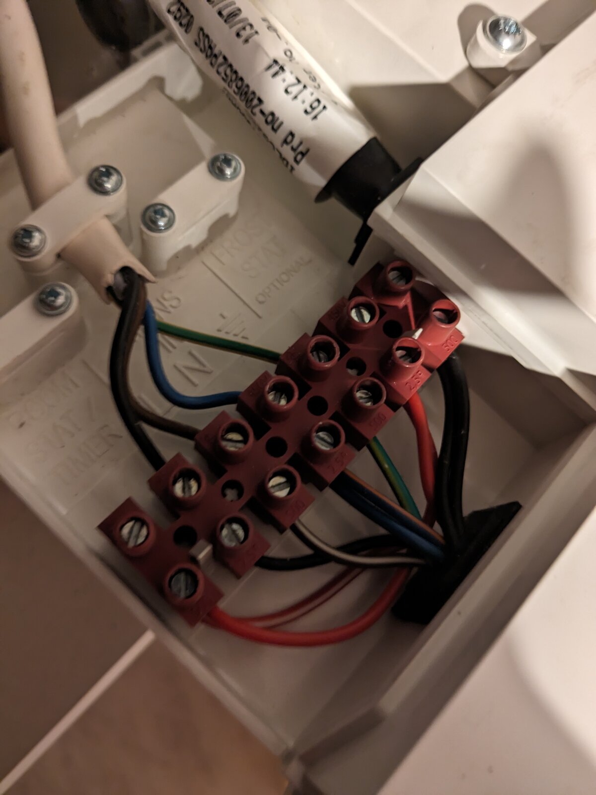 Engineer came in to sort it out, and was confused by the wiring. He tells me the red loop (left of pic) is where the thermostat controls should be, and also the two unterminated wires should not be that way ! I have looked at next door's, and they do not have the loop, they have what looks to be a stat wire connected.