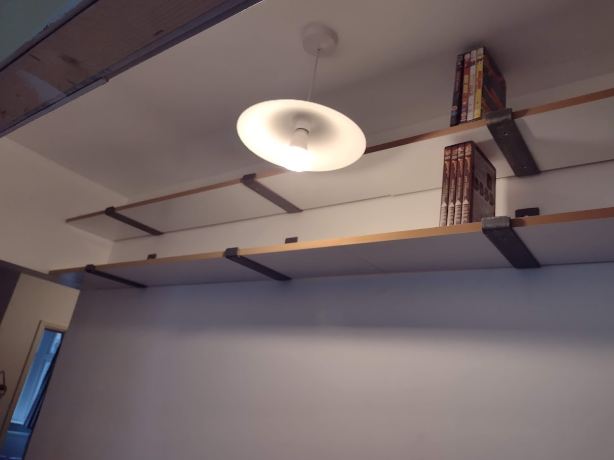 Shelves are up. Decided to get some scaffold shelf brackets and had CutMyPlastic.co.uk make me 4 shelves to fit. Bracket spacing and weight of DVDs won't cause sagging, and no brackets below shelf level. All looks pretty neat too! This is the second time I've used Cutmyplastic, very handy people if you want mdf (veneer and malimine options) cut to size and delivered to your door. They also do plastic! The brackets were ordered on ebay, made by VDS Metalworks.