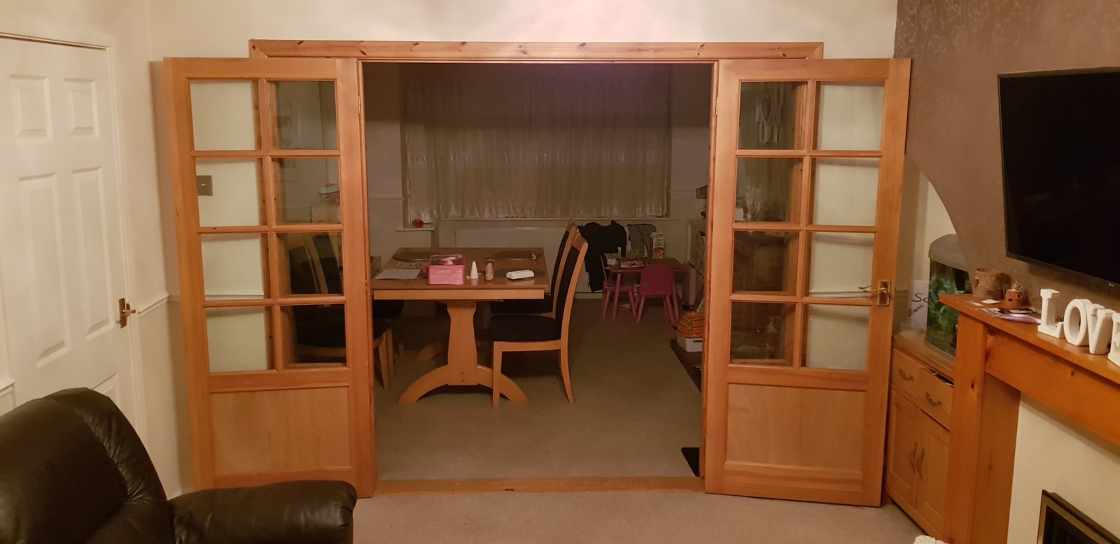 The wood architrave should only be decorative - looks a similar setup to our house. I closed ours in as it had a through lounge. My joists go from side to side too so can’t imagine it will have any loading. I also have a wall above mine although when it was a through lounge there was some kind of lintel up there with a bit of wall each side - exactly what’s there to the right of the door now with the same on the other side.