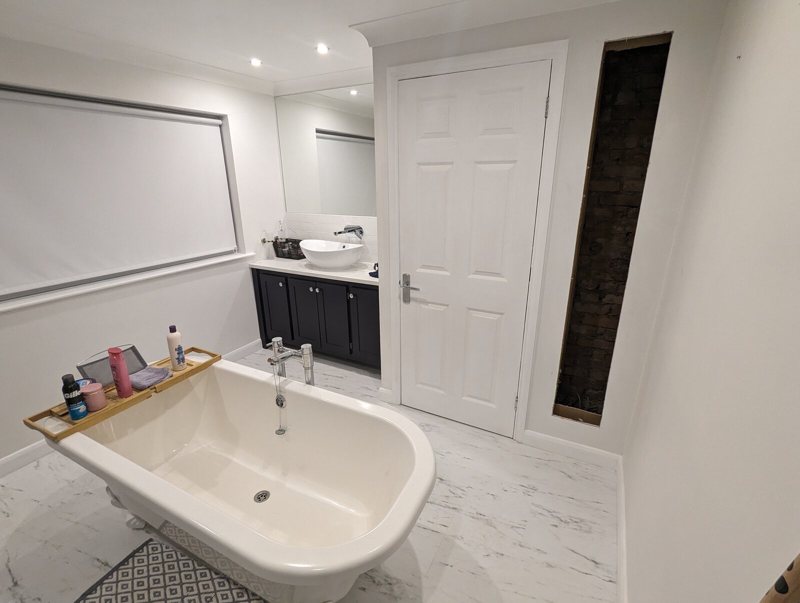 Conscious of the consumer unit location, tonight I made some exploratory holes in the plasterboard and found nothing to prevent me from opening up a nice tall opening, for said towel storage/shelving.