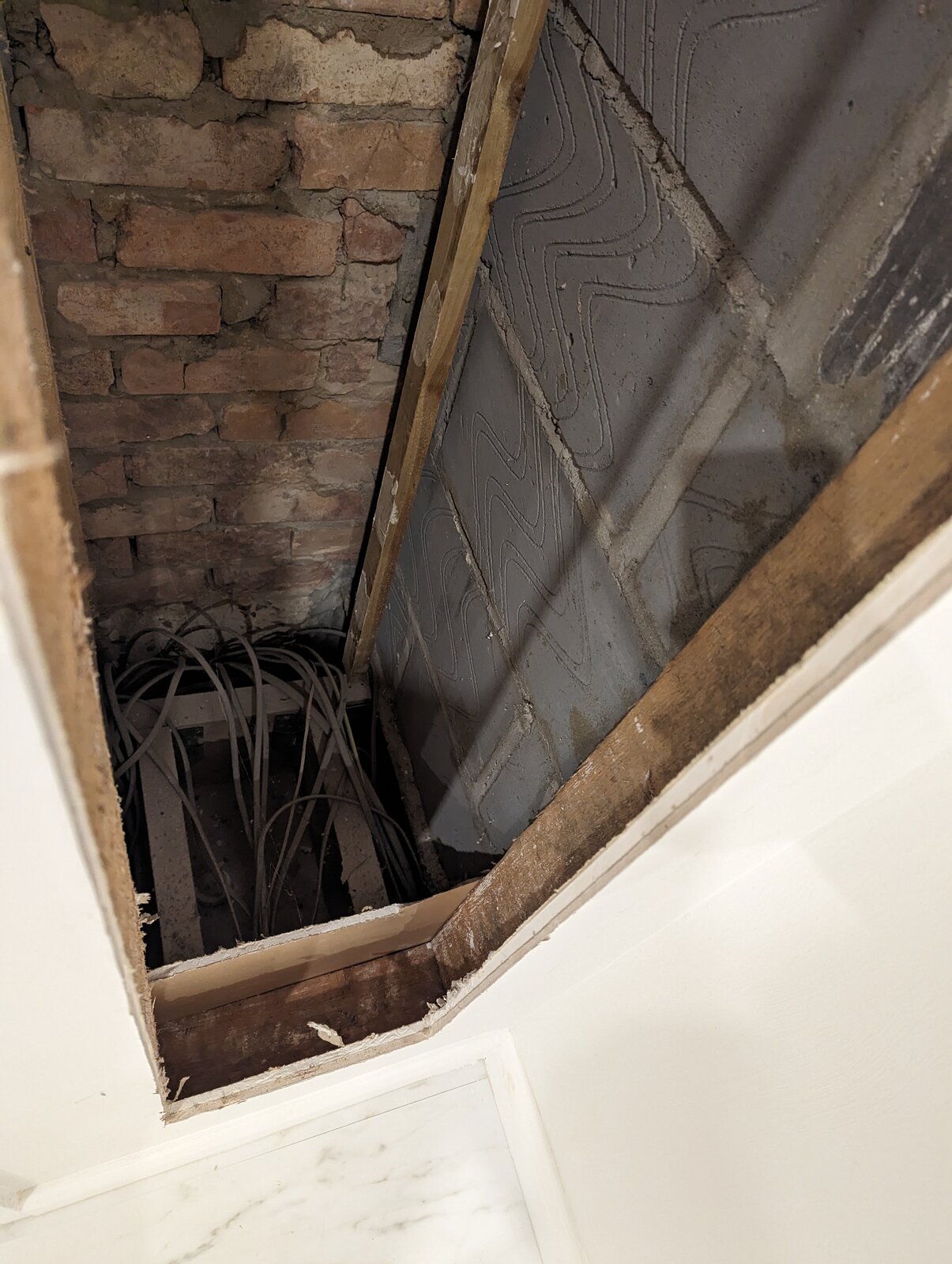 See picture of shape cut out of the plaster, and of the exposed void with cables now exposed from the consumer unit to various circuits.