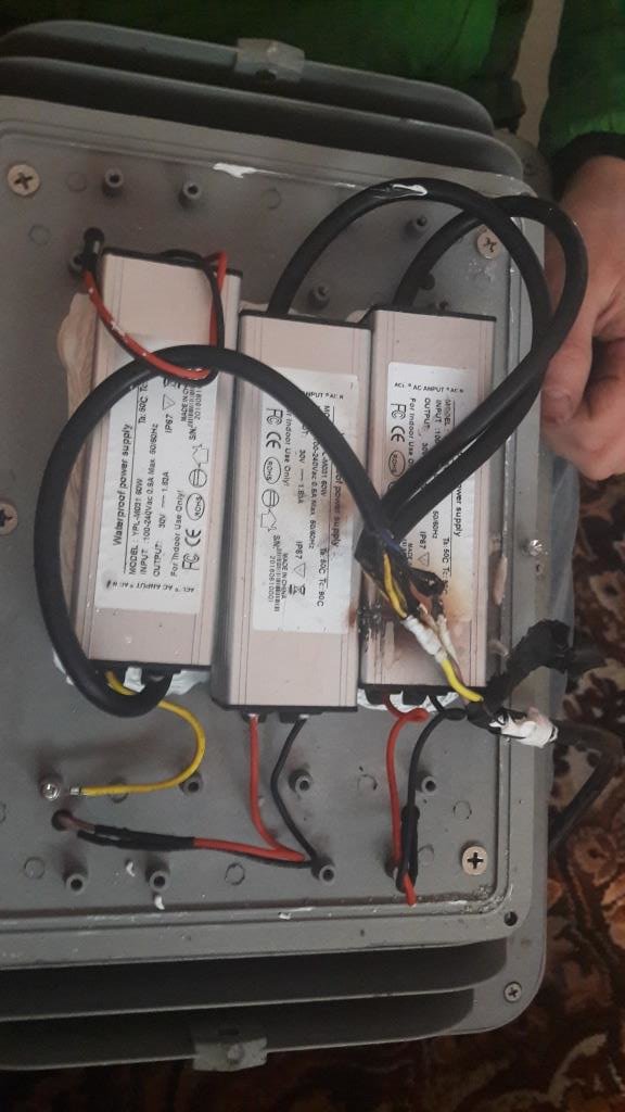 230VAC spliced into the driver whips. heatshrink not fully covering the splices.