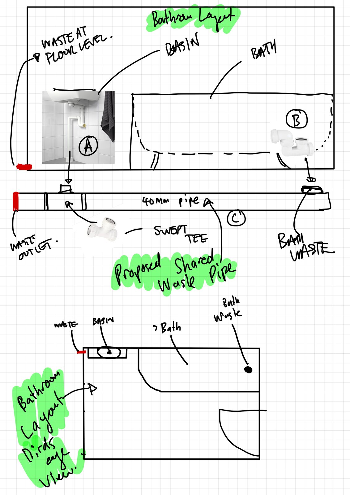 Hello everyone, I have a bathroom that I am renovating and the bath waste pipe runs just above floor level from one side of the room to the other where it exits via a waste that sits at floor level. As it goes across the room, it bypasses where I propose placing a basin. I just wanted to run the attached set up by some experts. I have read that when you connect bath waste and a basin waste that there can be some issues with vacuum, creating horrible smells and gurgling et cetera. I really want to minimise the pipework as the bathroom is small. So my question is this set up going to avoid that? The diagram attached shows what I propose. All the exact hardware I plan on using is detailed in the photographs on the diagram. My main query is if I connect the basin waste pipe straight down into the swept Tee will this be okay?