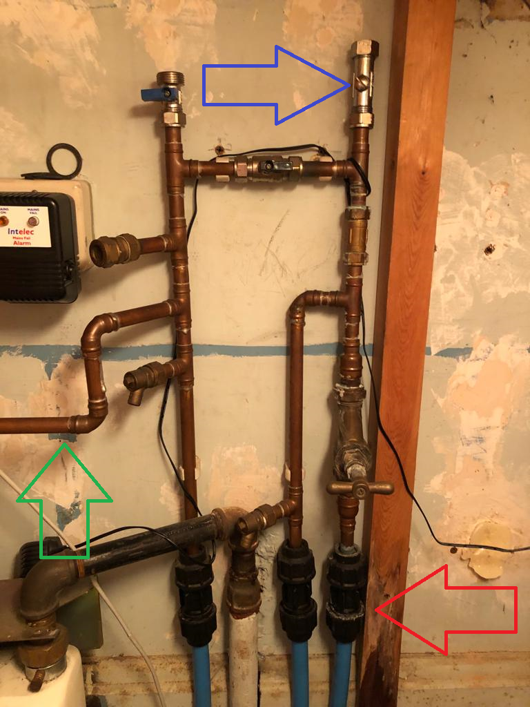 I know the red arrow if the mains feed to the house with the internal stop cock just above. The pipe marked with the green arrow is the cold feed to the downstairs toilet and basin. I assume the two feeds going back downwards under the floor go off to feed the kitchen and upstairs bathroom. What is the item at the top marked with a blue arrow; seems like it might be some of air valve? Also why are there two drain offs; is this normal on mains pipes?