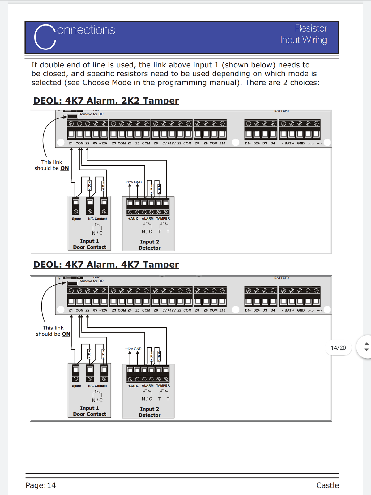 I’ve already wired it up DP, because that’s what I was use to. My confusion, is because zone 1 is used as Tamp circuit... and that would normally have been my EE... but not a problem. Zone 2 therefore, is instructed to be EE ( door sensor) in the manual, but it seems strange to connect this to OV and COM. There is another 12+ and OV on the 3rd bank of conn blocks, so if I’m really confused , will use these 2 to power sensors.