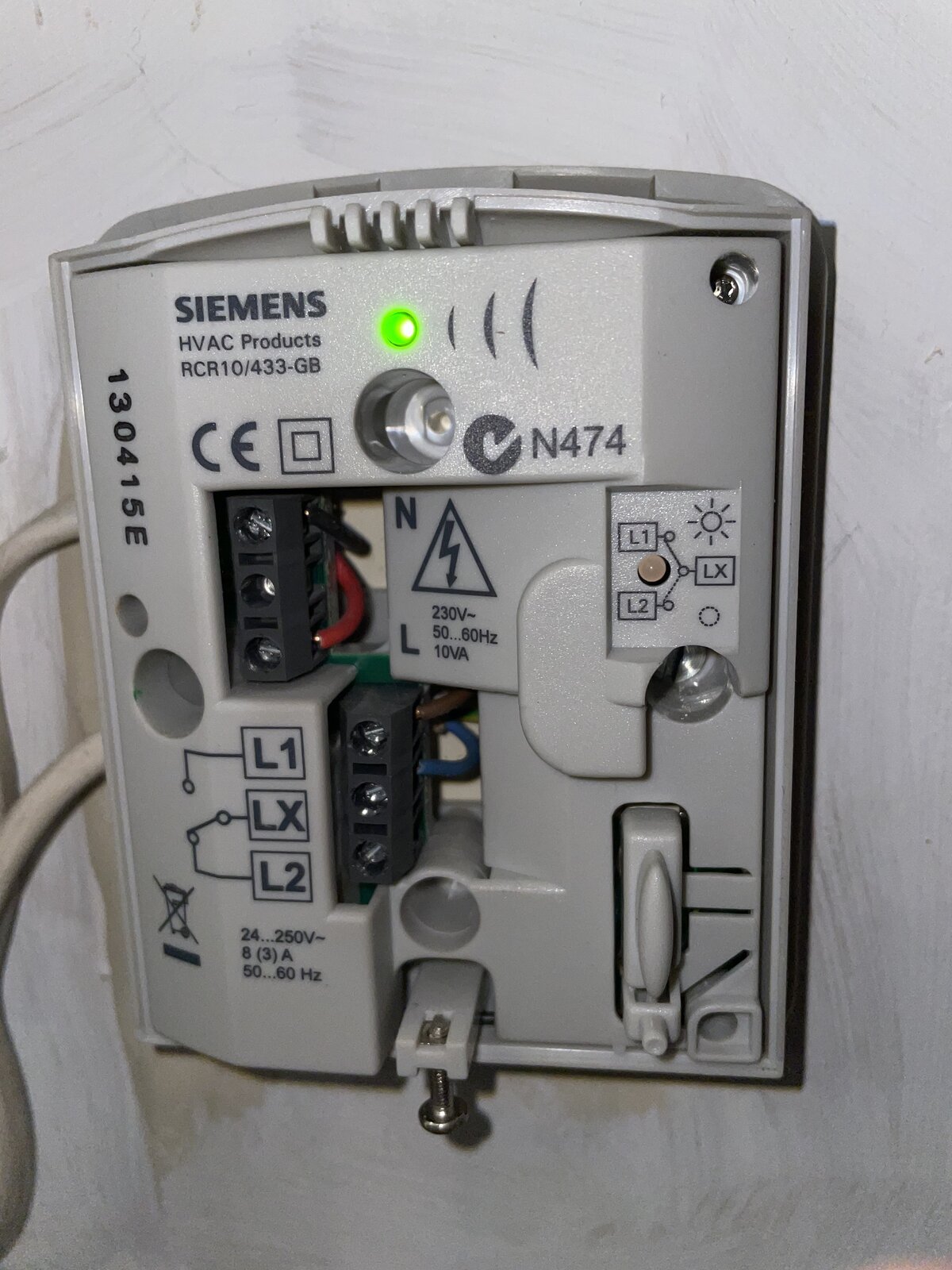 I currently have a Siemens RDJ10RF wireless thermostat which communicates with a Siemens RCR10/433-GB. The latter is wired to the boiler with a red and black wire to L and N respectively and brown wire to L1 and Blue wire to LX and a yellow/green wire. (See pic)