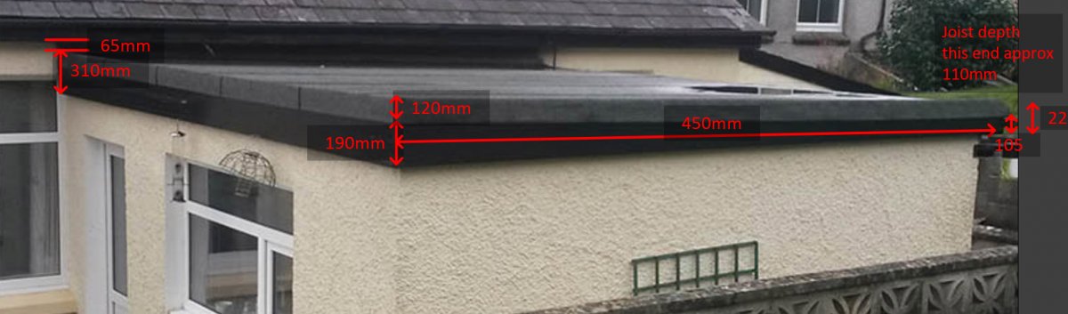 Btw, the joists in the extension run parallel to the house (hence potential for through ventilation but with snag described above). The current roof has 50mm joists at 400mm centres which fall to a depth of about 110mm at the shallow end. OSB on top of this (prob 18mm) with built-up felt covering