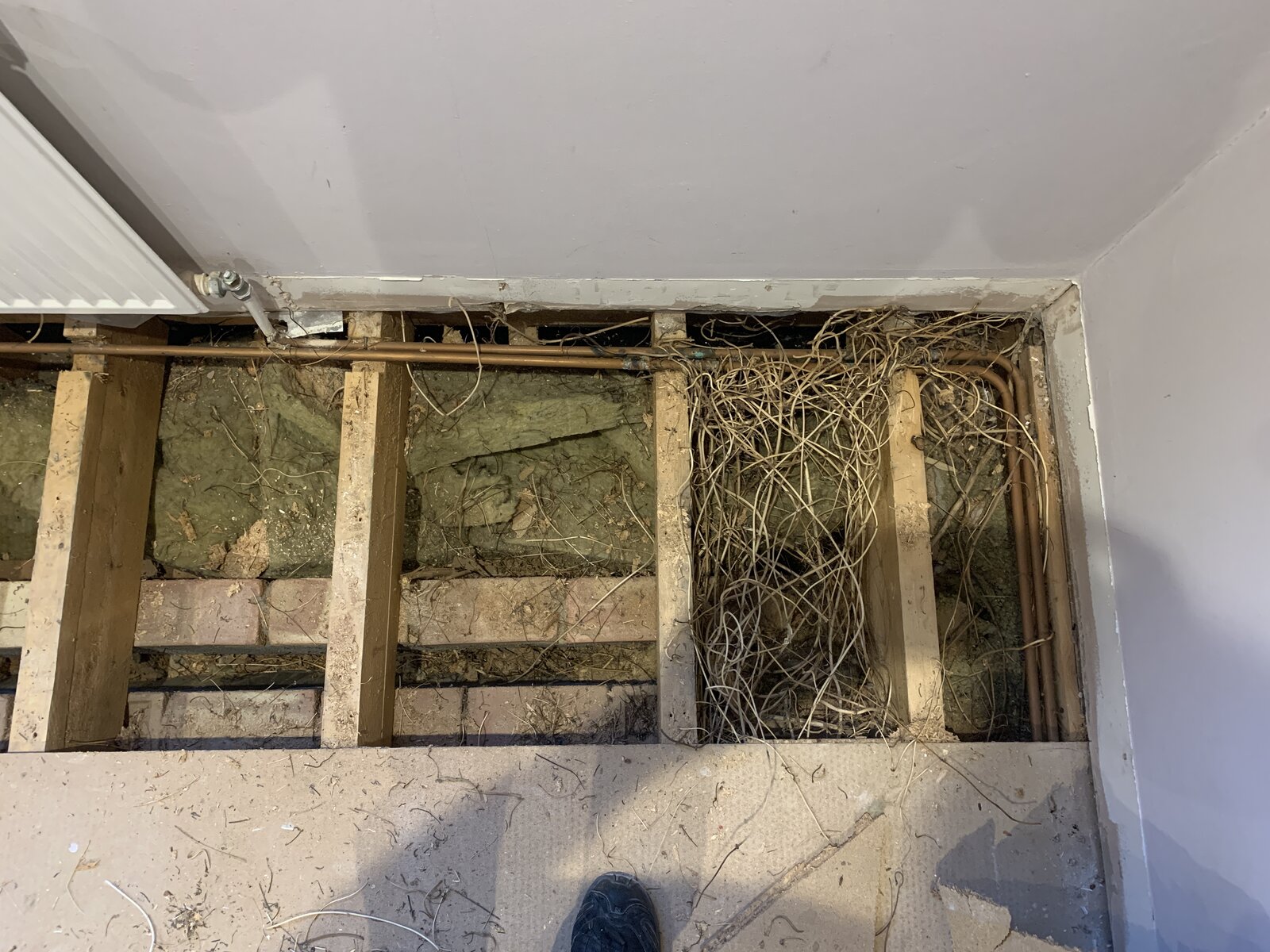 Currently doing some small renovations to a new house. One of the upstairs bedrooms 'juts out' over a bay window in the room downstairs. This section of the property on the first floor is timber frame. In the past a tree/plant has been allowed to grow up under the floor and as I'm also going to be replumbing a radiator in the room, I've taken up the floor to do new rad tails and remove said plant.