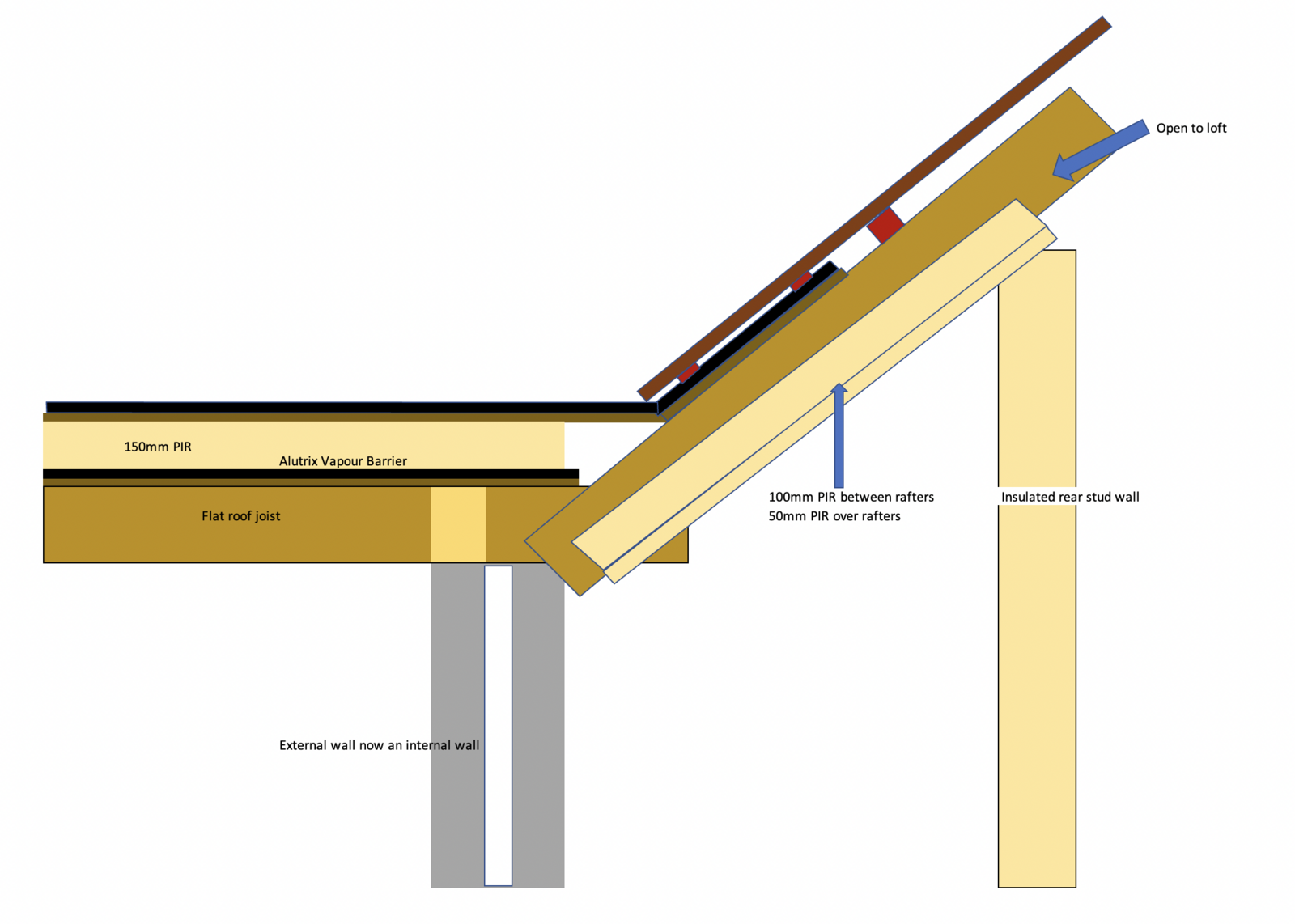 I'm thinking the Flat roof Alutrix vapour barrier needs to be taken up vertically to seal off the end of that insulation from the potential cold spot of the upper deck and then maybe pack that area somehow with insulation but maintain the airgap in the upper half of the sloping rafters, maybe vent along the bottom of the tiles somehow - or as it is only a small section of vaulted roof (2.5metres wide by half the slope of the bungalow pitched roof) then will that be ventilated enough already?