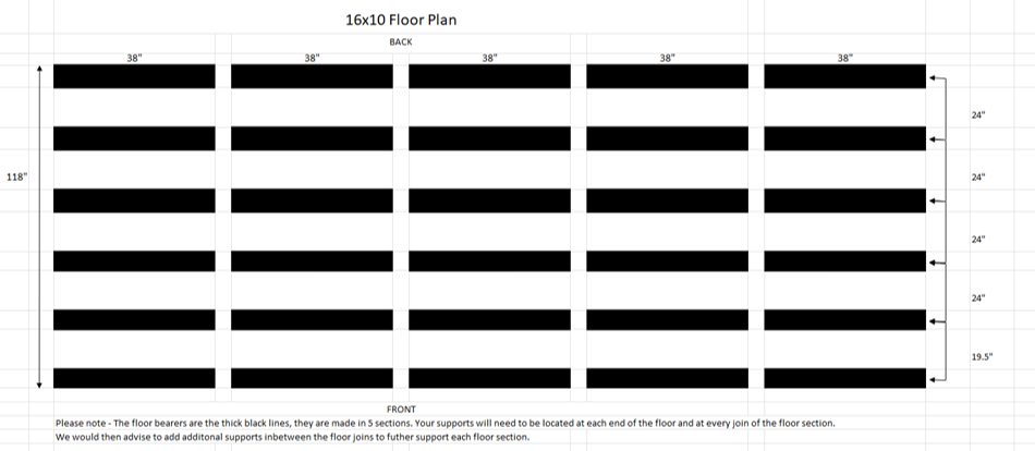 The floor comes in 5 premade sections and they provided a sketch and a photo (attached). they advised the floor bearers are 3x2 with 2" height from the ground.