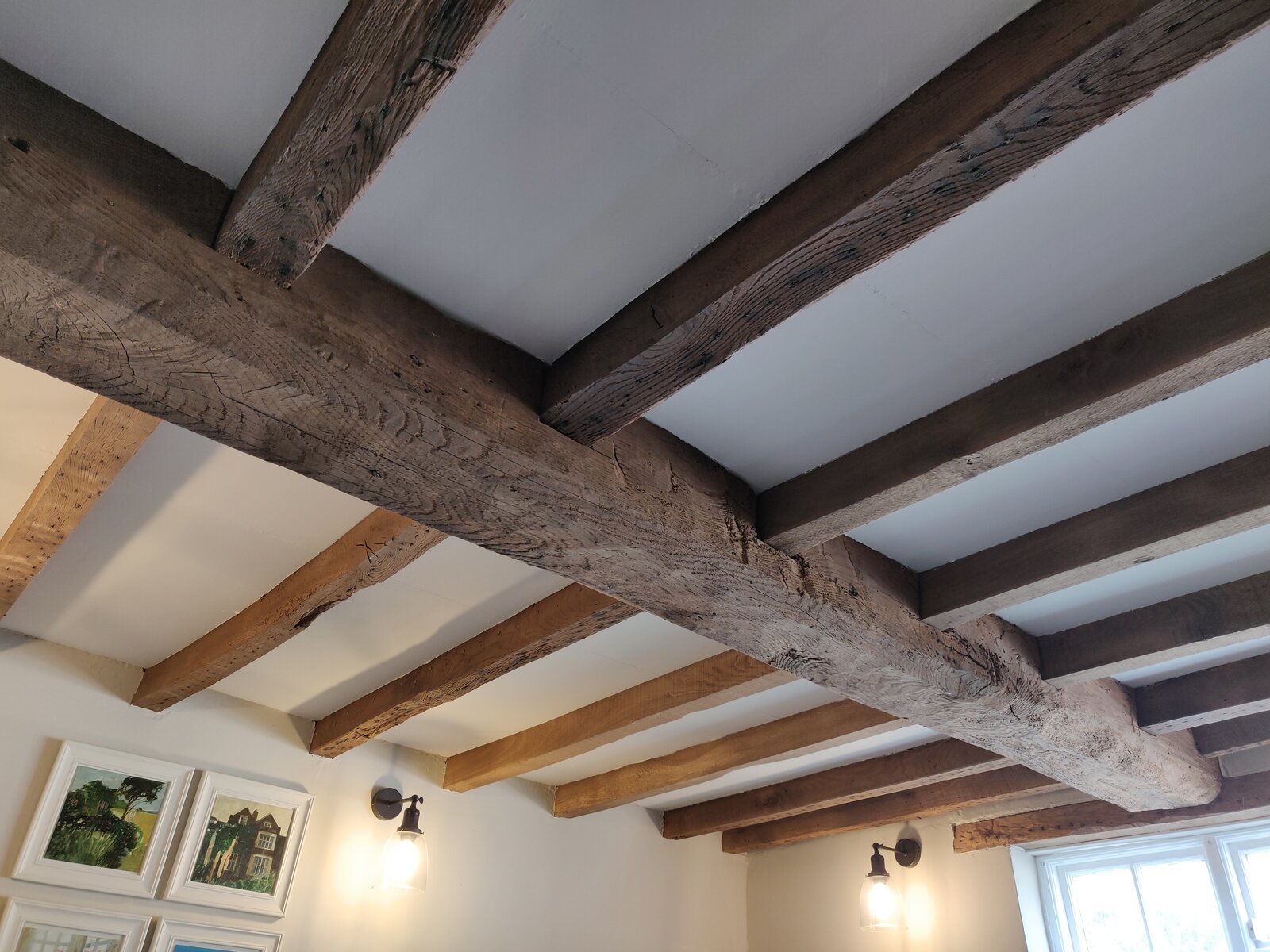Issue: Old cottage with crossed exposed beams in one ground floor room. However, in the room above there is only a layer of ply board and then the carpet on top of the beams. As a result, there is no thermal insulation between floors and the ground floor room is almost unusable in winter without constant heating, as all of the heat escapes into the room above.
