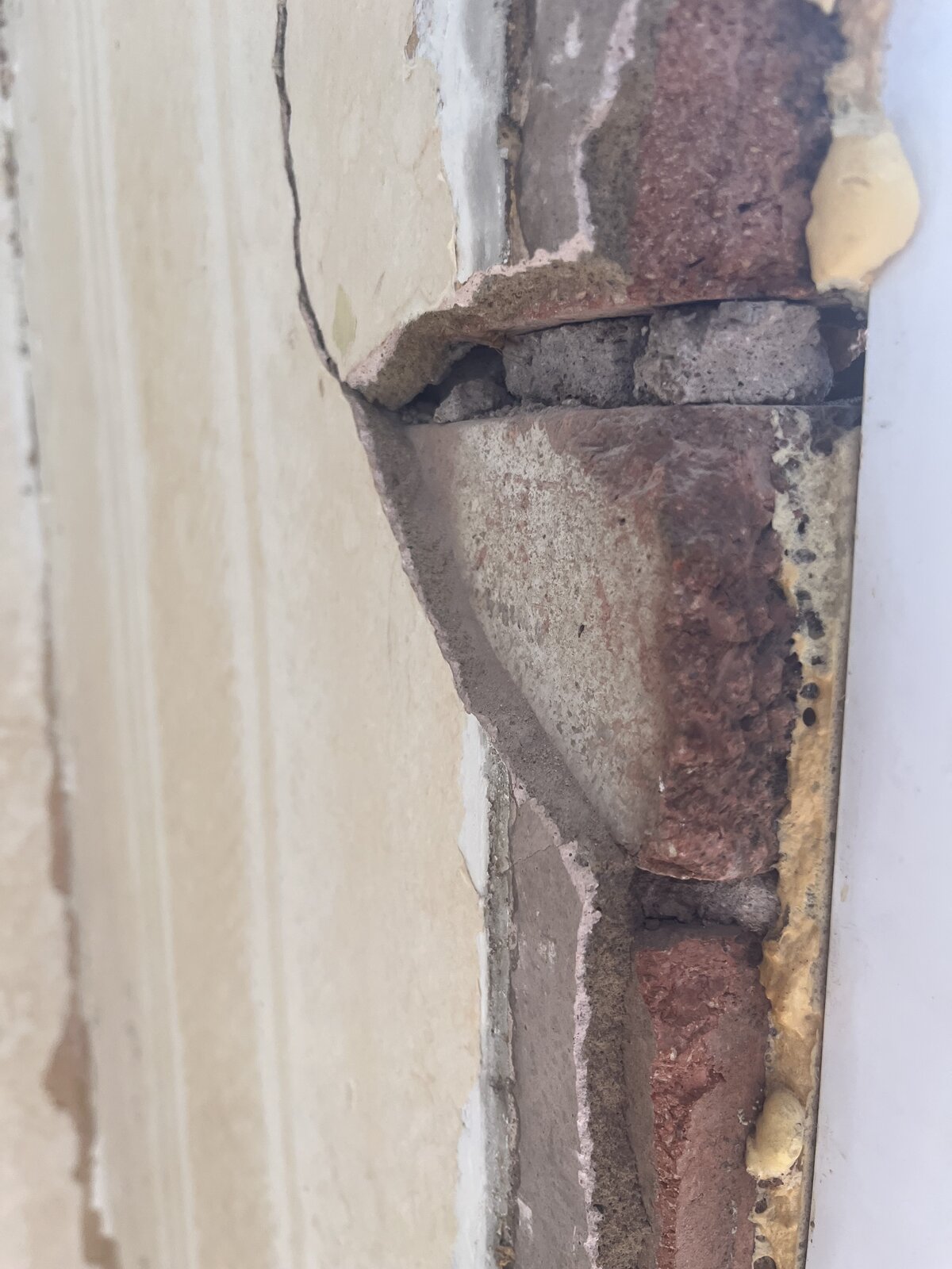 It's a 1930's build, terraced house and the brick work in question appears to have had a render between 10mm(L) and 20mm(R) with a plaster finish of maybe just 1mm applied internally. Externally, the brick is just red painted. It's not directly exposed to the elements.