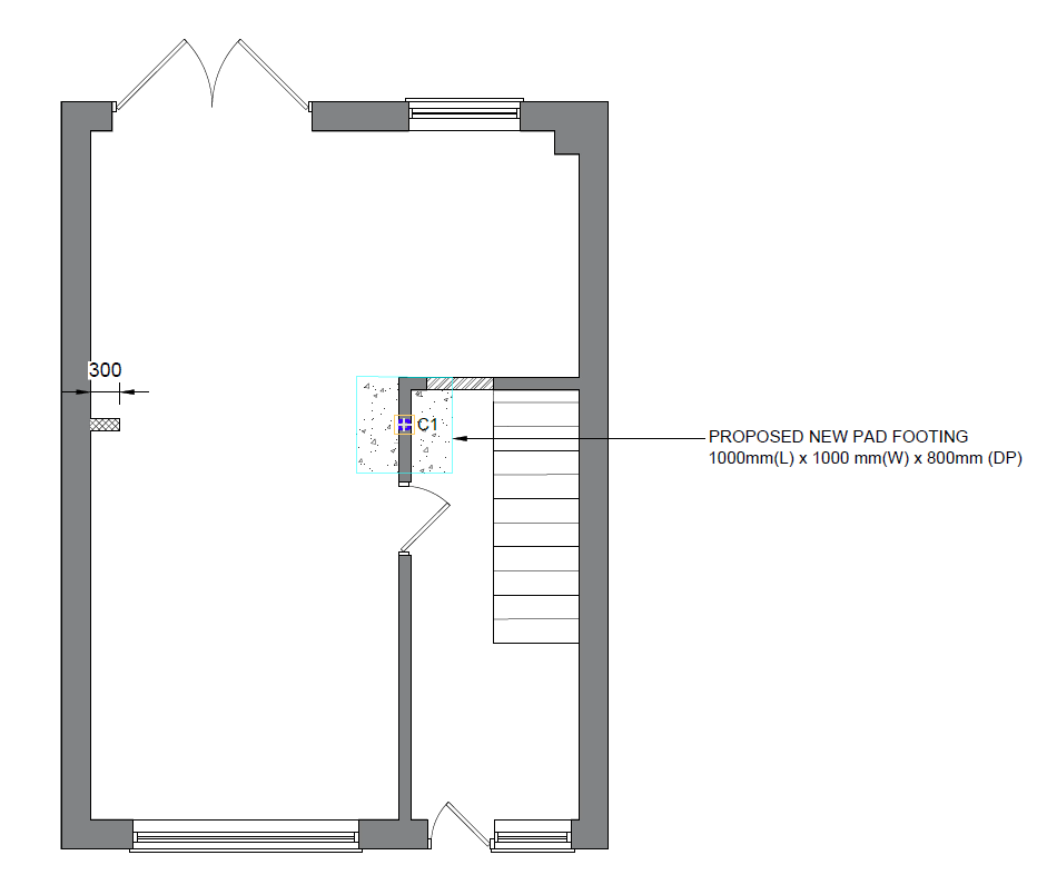 I had the structural visit and the proposed designs and calculation but couldn't make sense the part where they're telling 1000mm x1000mm x 800mm pad footing for a steel column. Existing wall spans about 3 meters (with 1.2 meter doorway starting from left on the below drawing. Two questions I have regarding your experiences, who should verify if the existing foundation would already satisfies this or not and how? Does this seem reasonable to you?