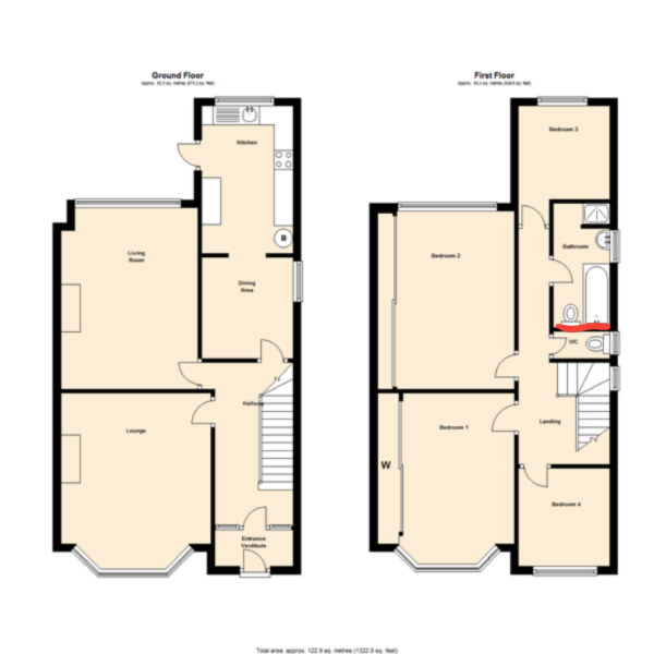 Hi all, in have a 1930 semi detached and I am looking at taking down a wall upstairs. The wall in question separate's a single toilet from the bathroom which also has a toilet bath etc. Apparently this used to be thing back in the day but to me opening it up to make a larger bathroom makes more sense now. Anyway I drilled a test hole through the wall and to my suprise found it to be orange dust. It quite easy to drill through so not sure it's actually brick?? There is no wall under this wall and it is within 1 meter of a load bearing wall. Also the layout downstairs is identical and this only has the 4 external walls for support. I have inspected in the loft and there is nothing above it except the normal joists which run straight across where the wall is. I am just suprised as it is a pretty solid wall for upstairs with nothing under it. It is however sat on one of the floor joist but built directly on top of the floorboards. Any advice on weather I need to support the ceiling/loft floor when this is out or will it be fine to come down?? I've attached a pic of the floor plan's upstairs and down to try and make it clearer. Wall to come down is in red. Thanks in advance.