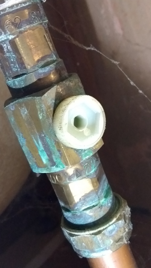 ...it's on the hot inlet to my bath tap (and I am wanting to replace the bath...). No other isolation valve apparent between immersion and tap. A hex key in the inner opening just rotates as if worn, the outer is more than twice the size of any hex key I have and although the outside is ribbed, i cannot turn the white plastic using mole grips....