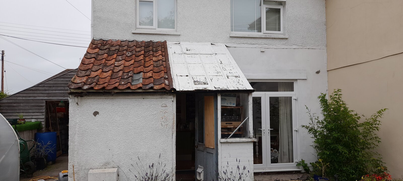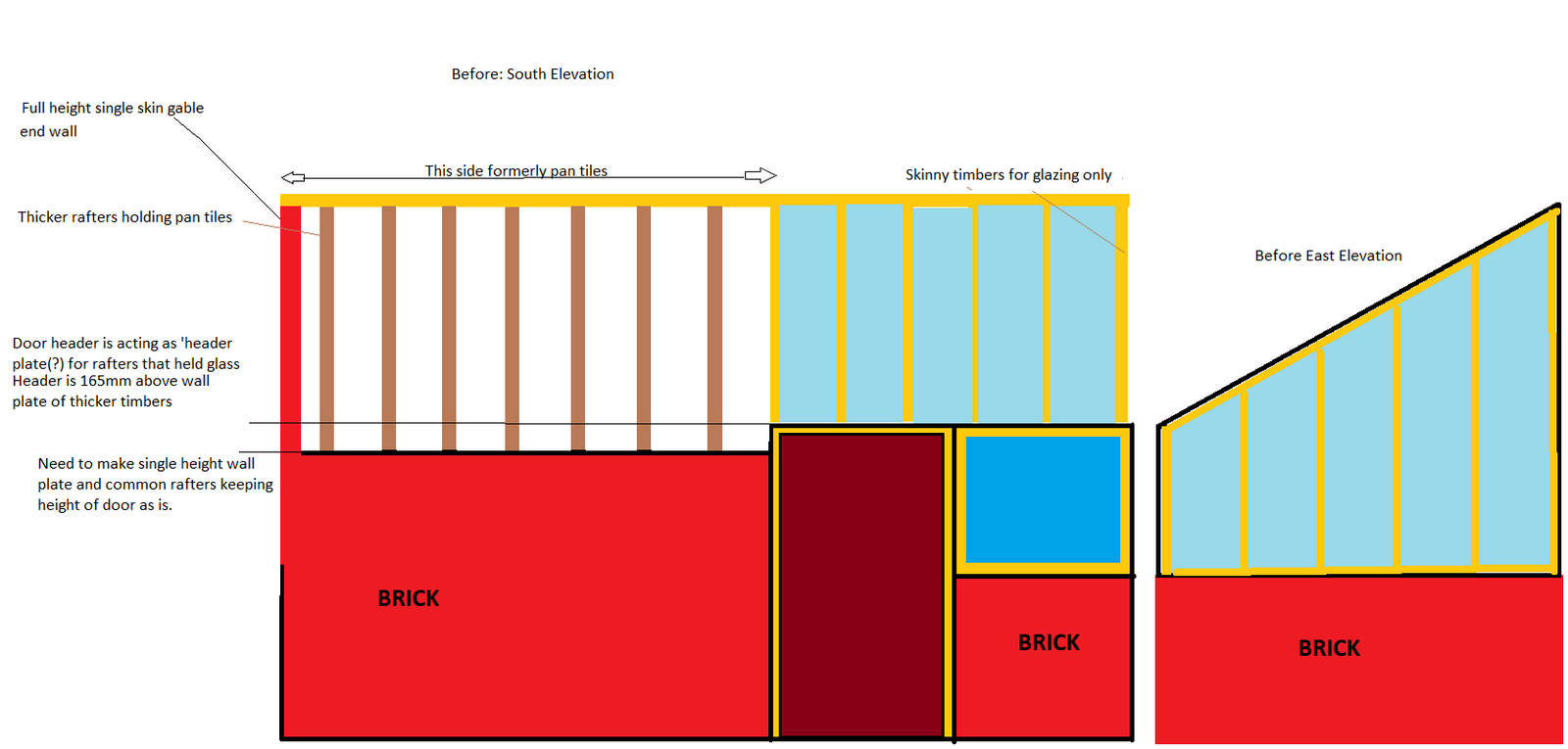 I have to build up the wall on RHS to door header height, and build in a lintel that can bear tiles from the 3330x2550 roof, across the door. Rafters (6"x2") at 400mm centres.