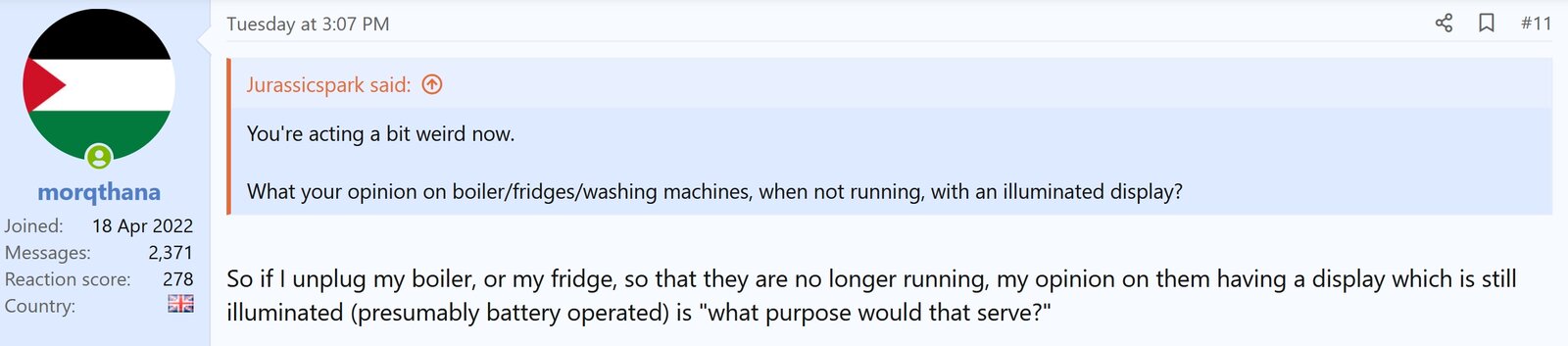 So when I ask "why does a shower need to be on standby?", and you say "Some fancy, although rare, digital showers have a display and can use a few watts"