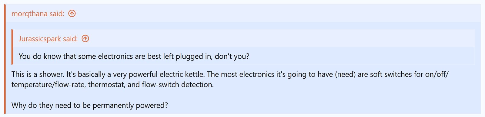 and I neither misunderstood it nor challenged its veracity. What I did was to assume it was 100% correct, and ask why a shower needs to be on standby.