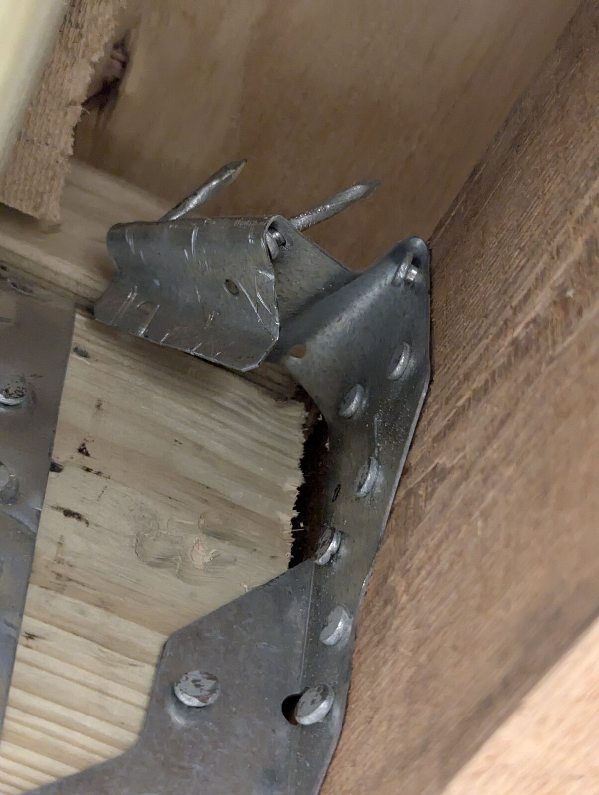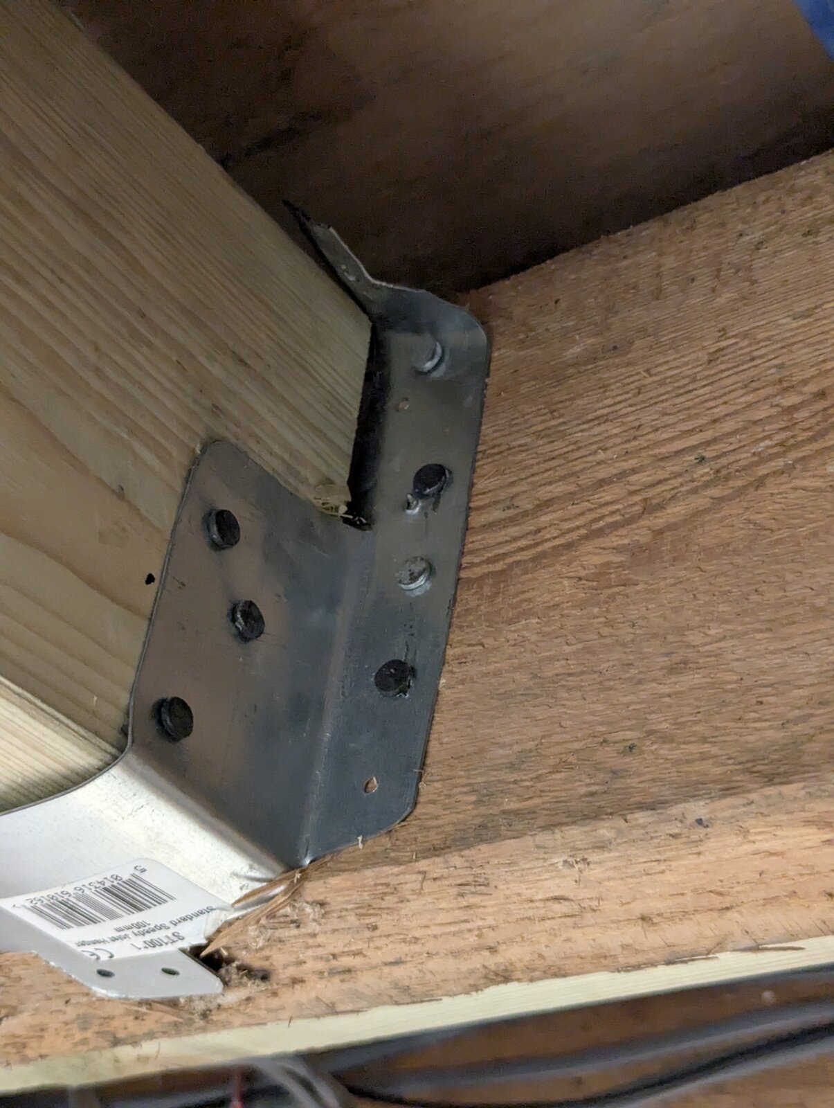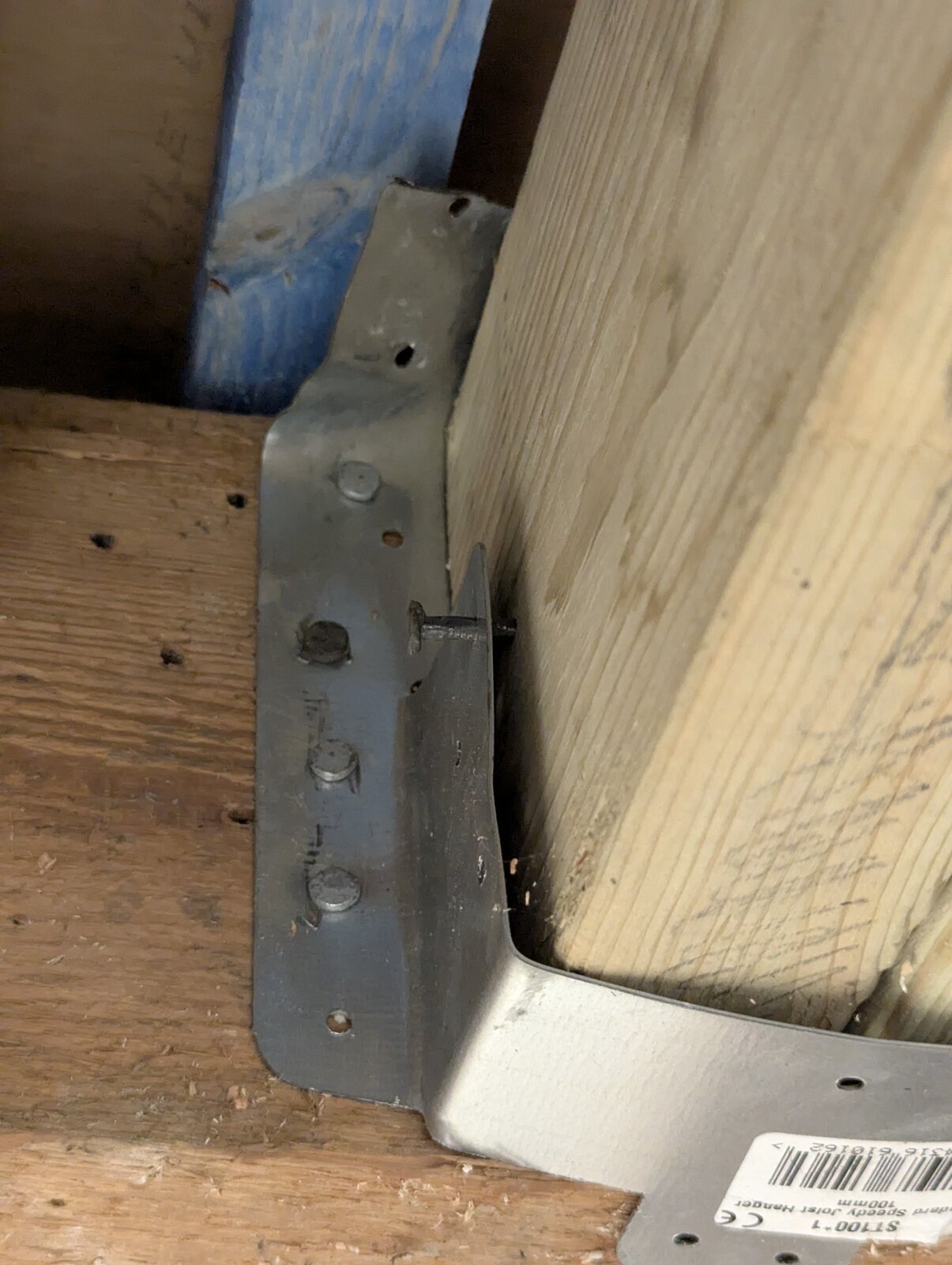 They are refusing to go back and correct the work, saying that what is there is more than adequate. The roof light is around 120kgs plus all the surrounding timber and deck. I guess 250-300kgs total supported on these four joist hangers.