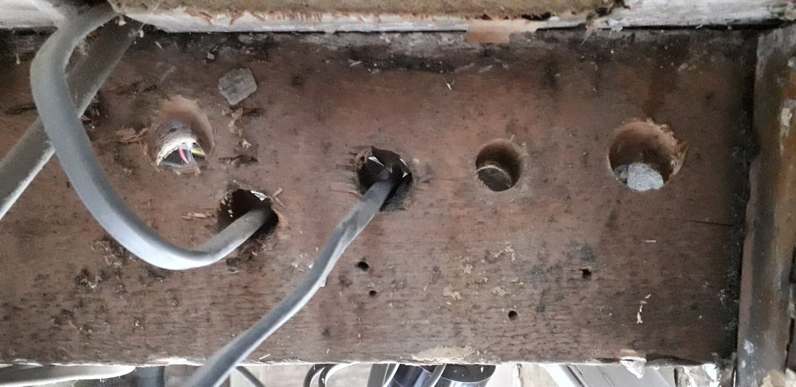Would timber plugs sealed in with resin be a suitable repair for this joist? We could thread the cable through just one hole ...the remaining four would be redundant. Replacing it would be quite complex so we would like to avoid that.