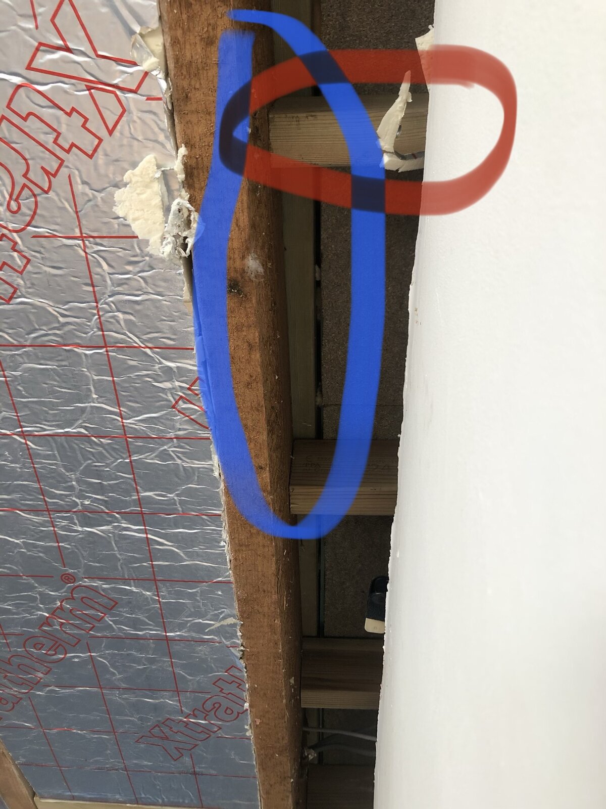 blue shows the upstairs internal wall, red shows noggings.