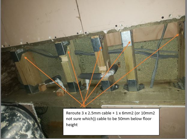 I am planning to cut and reroute 2 core and earth cables 50mm lower through precut holes in noggins. Specifically three x 2.5mm2 cable and one x (either 6mm2 or 10mm2, I can't tell which) cable. The noggins were added to better support the floor above. All three cables should fit through the precut 18mm diameter hole
