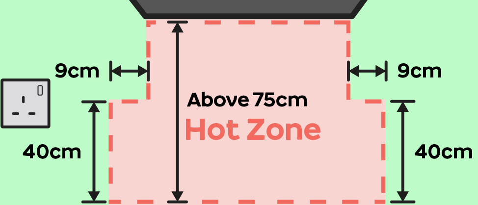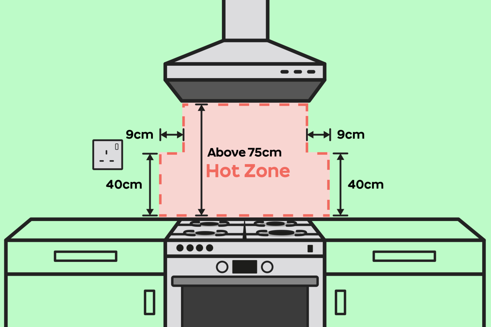 I have seen this morning, 100mm from edge of cooker , and also 300mm from edge.