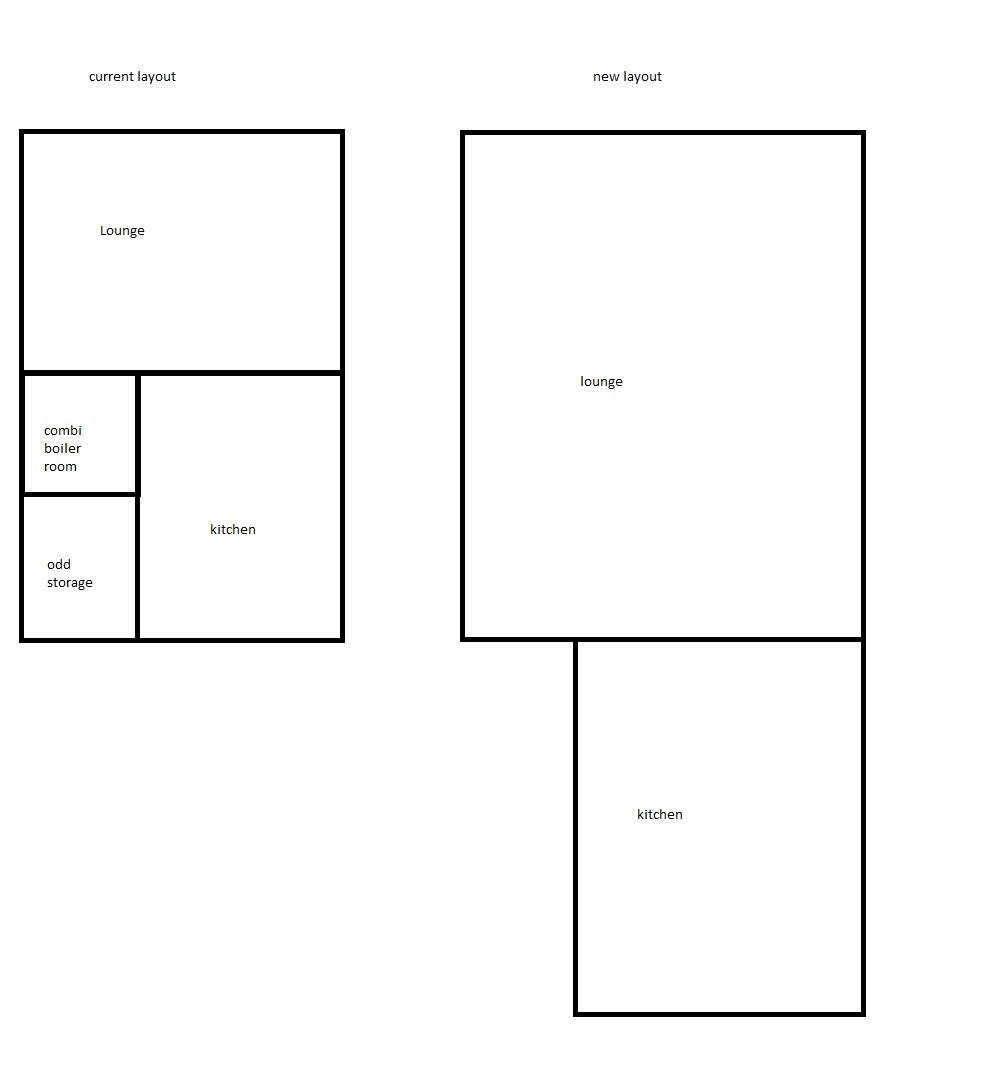 So would like to get rid of cupboards move boiler to the kitchen in new extension and lose the odd storage cupboard, this makes the lounge a rectangle shape
