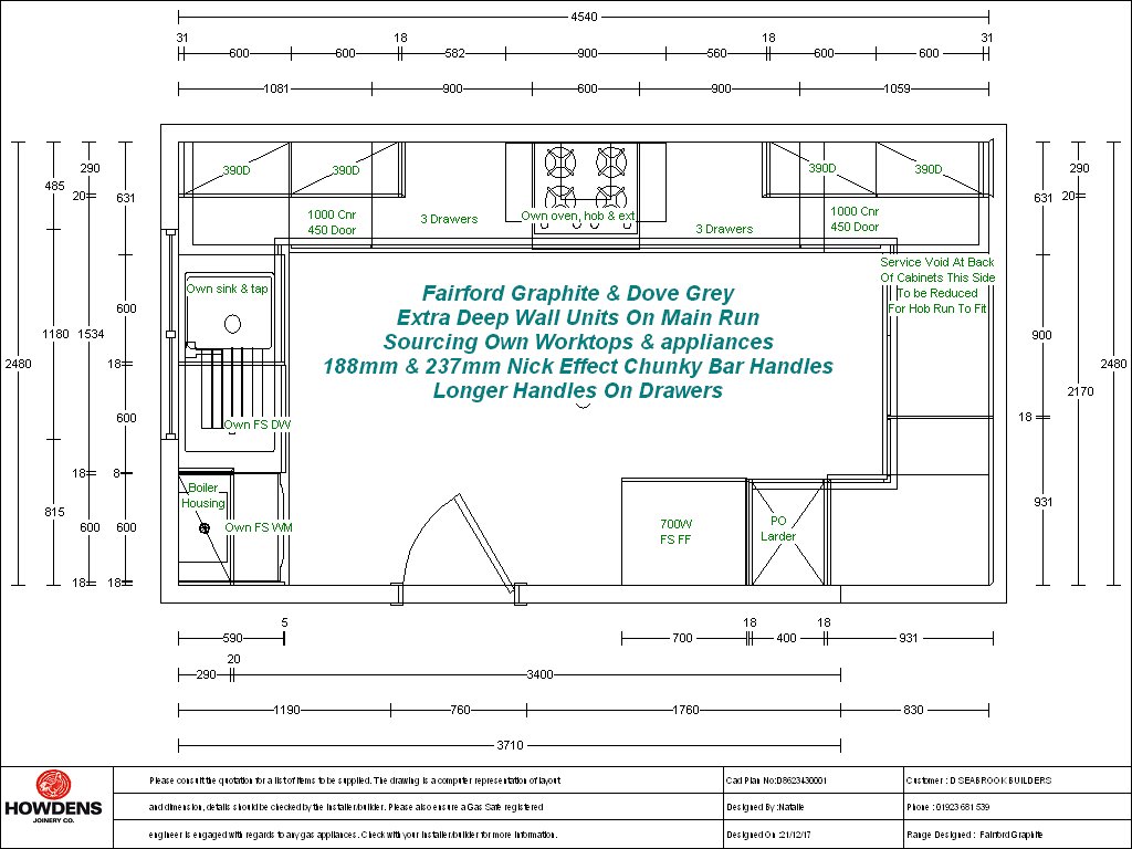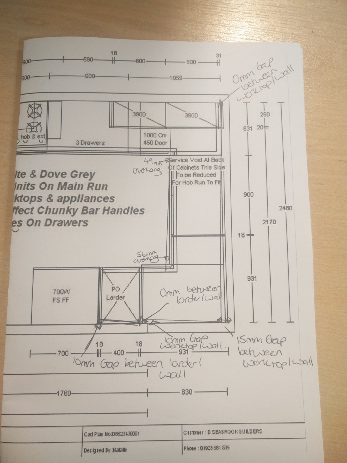 One of the worktop joints is not at 90 degrees its about 2mm off of square between the front/back to the worktop. This is resulting in the worktop moving away from the wall (by our calculations by about 6mm at the far end where the gap is currently 15mm). The overhang at the front of these cabinets is also not the same all the way along - being 49mm one side and 56mm the other.