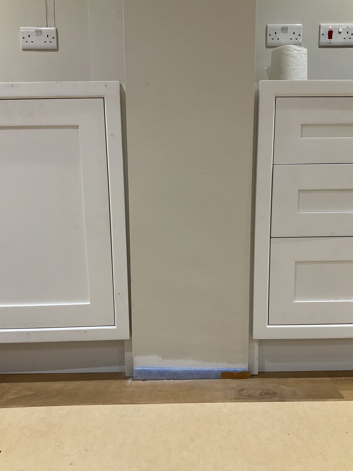 we are having a kitchen fitted, all bespoke. While you can see to the right of the old wall the units are level to the wall the left are not.
