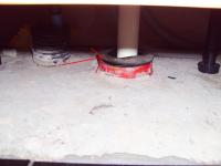 this pipe enters what looks like a large pipe that's in the actual subfloor and there's a black cap-like item on this large pipe out of the subfloor.
