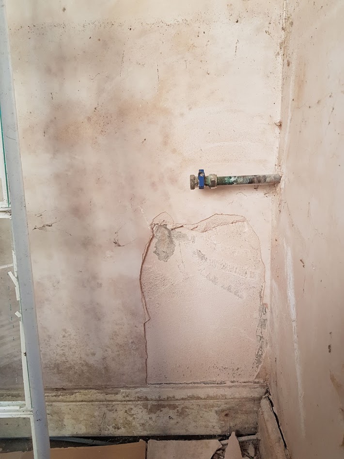 I can see now that the kitchen has been ripped out, there is light mould on the plaster in the bottom corners, screws fixing the skirtings are rusty, a backbox (1.5m height) in the south wall is rusty too.