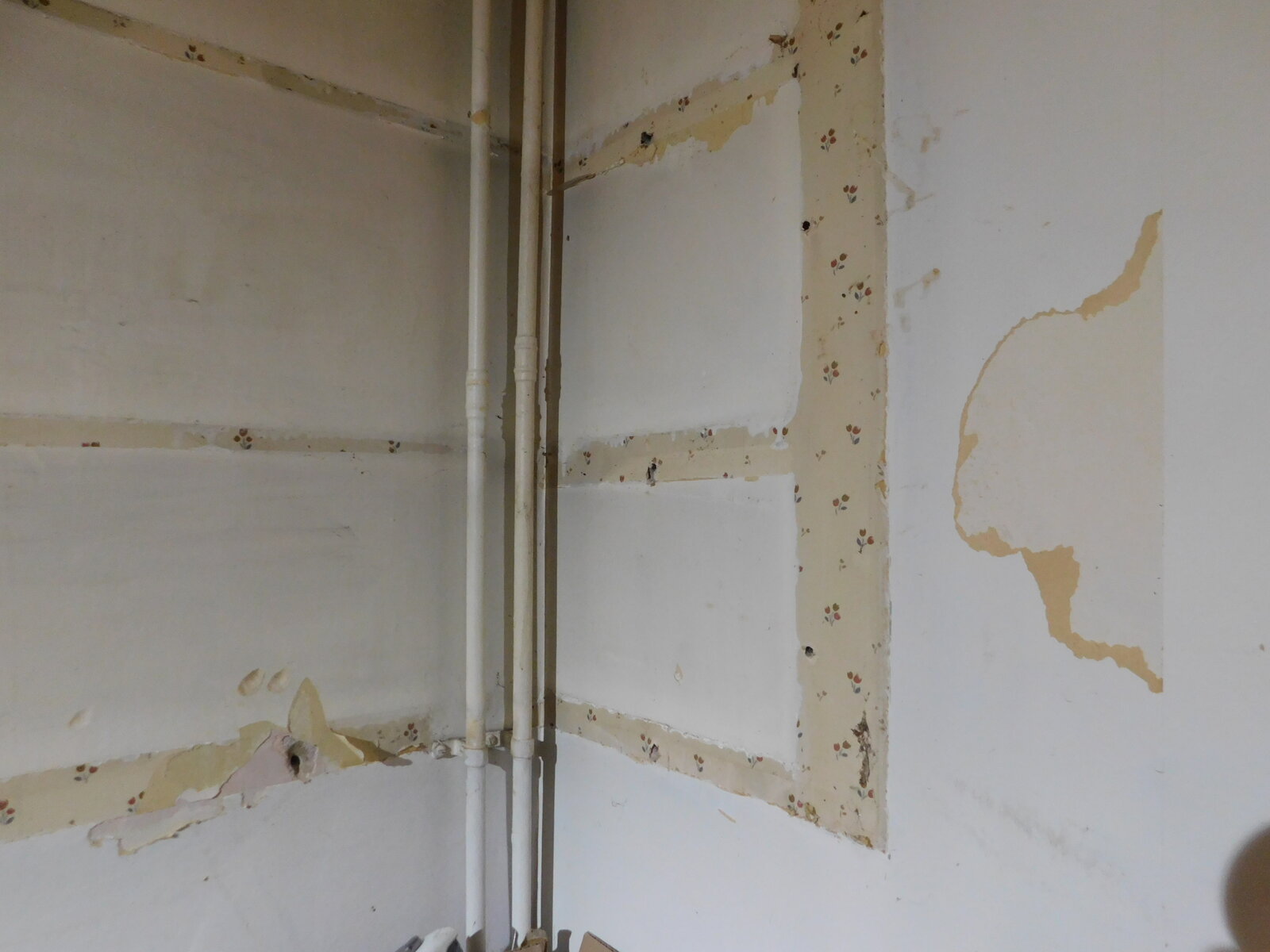 I'm in the process of preparing to install a new kitchen. The current kitchen is really old, probably been in 30 plus years. The house itself is also old (1785). I have attached some photos of the state of the wall after starting to remove existing cupboards. parts of the already exposed wall are done in lining paper (I think) and are in ok condition. Others have some lovely floral paper behind the old cupboards. I'm not sure what to do with the walls - any thoughts? I'm not sure if it would need plastering/skimming, not really sure of the difference and in what scenario you would do which. I've done plenty of filling/patching holes in the past so happy to do a thorough job with that if it might be best? Due to the age of the property I accept there will always be 'quirks' with the walls - there is one major sloped wall in the kitchen. The pictures show the main area which won't then be subsequently covered by new units, so I want them to look as good as possible. One picture also shows the gap behind the oven and it seems that there might not be any plaster etc down the back there, just exposed stone. I'm thinking this isn't too much of a problem, when the new worktops are in we will be tiling up from them on the wall.