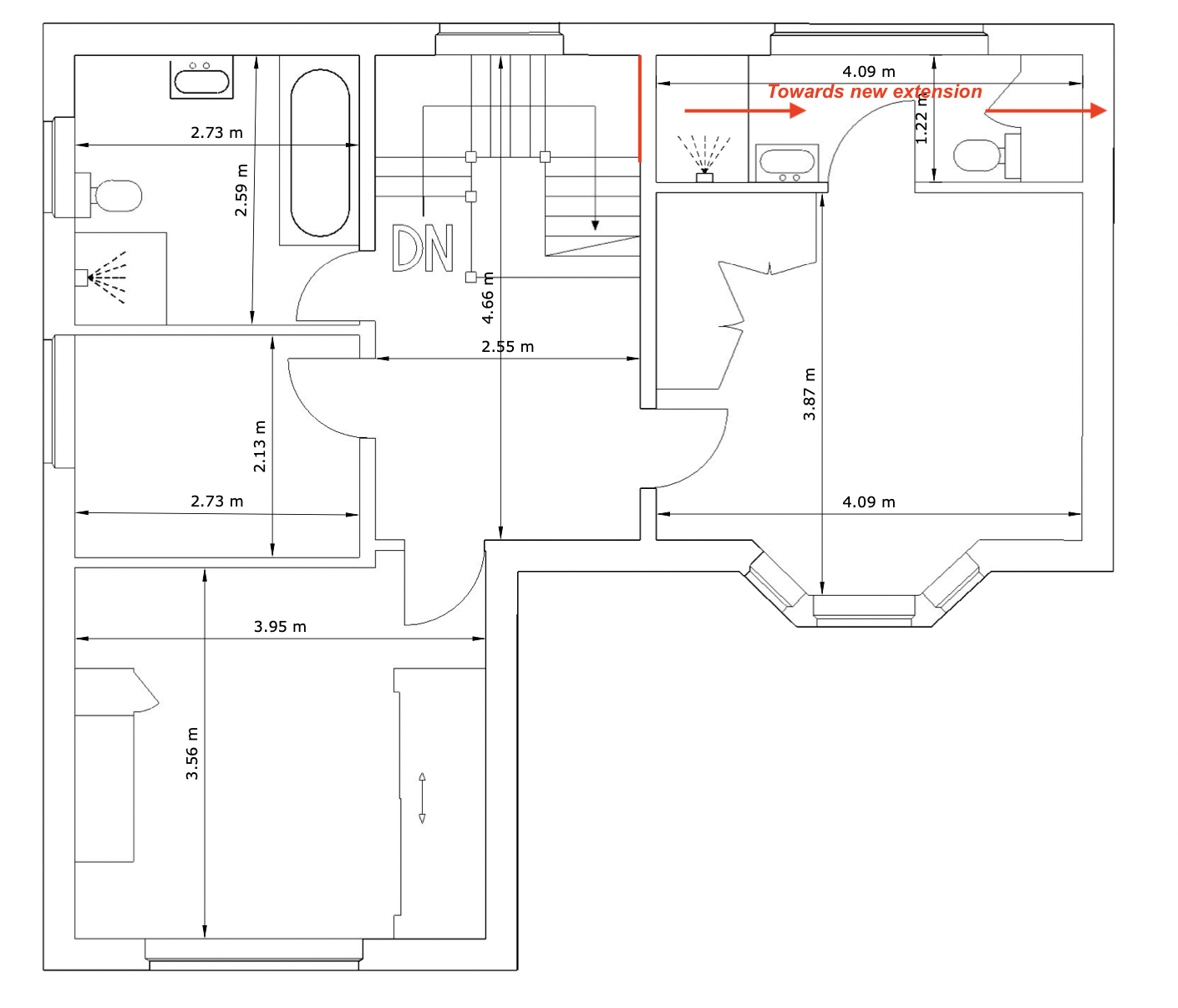 The idea is to knock through as much as possible height wise so that the general feel of the staircase is maintained and build about 7 steps to a landing that would lead through what is currently an existing en suite bathroom of a master bedroom to the planned extensions 1st floor area where new bedroom and bathroom will be. This will mean the bathroom will be replaced by a landing as attached.
