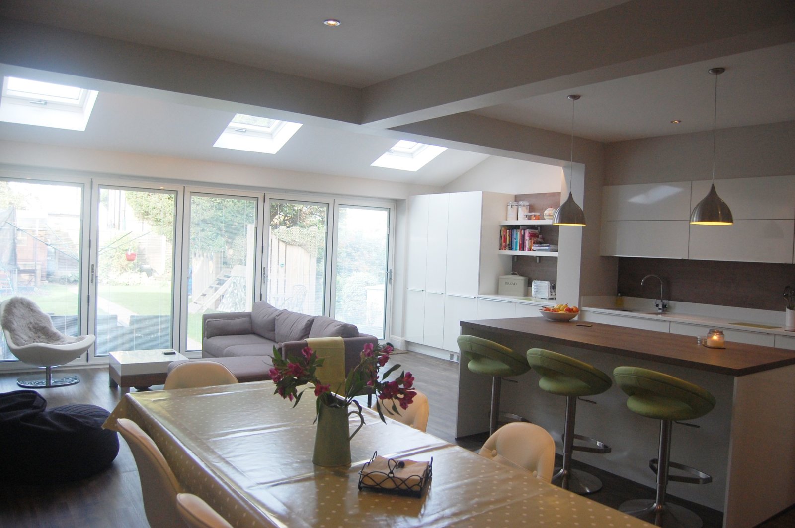 Background: We live in a London suburb, semi detached house with an existing 3m rear extension (3.3m at eaves, a flat roof, built ~8 years ago).