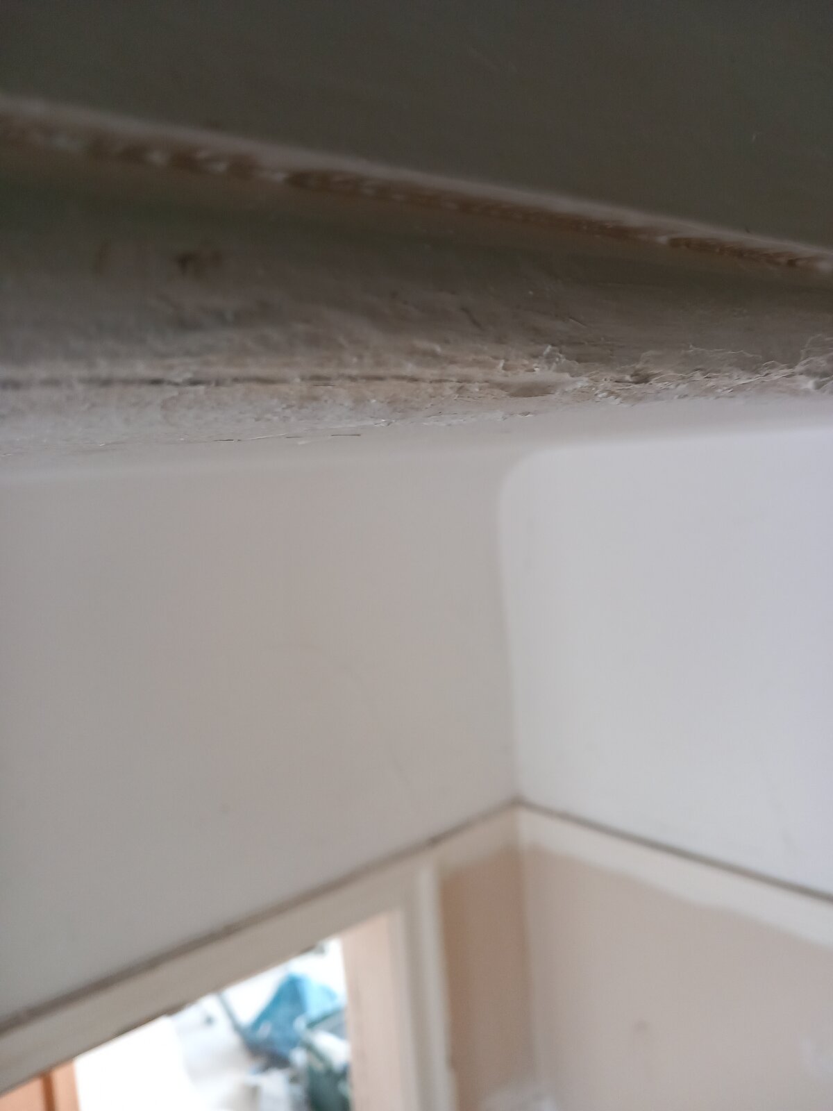 The ceiling plaster meets the stairwell at architrave around the stairwell. The architrave is round at the edge. The plaster is a 5mm below the architrave. The paint has been used to fill the gap between plaster and architrave which has made it look horrible. See photo.