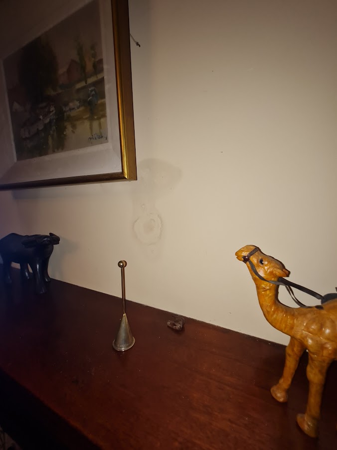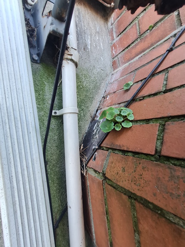 Middle picture - there is a strange " joint " in the rainwater downpipe . Plastic stuffed into iron pipe ? surely that leaks - the green on the wall and the litle plant growing confirms it - possibly