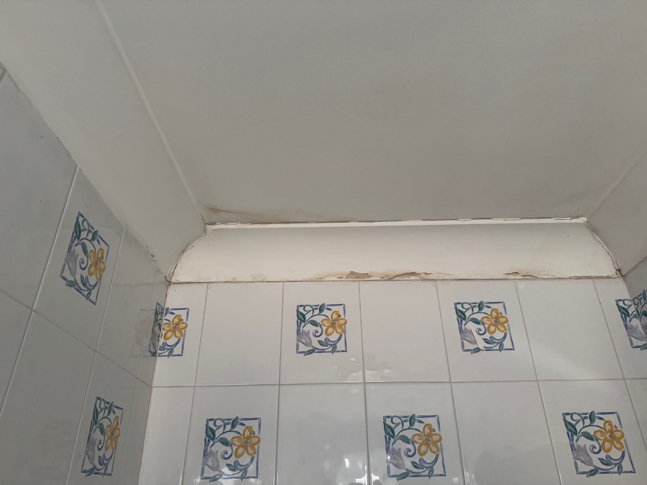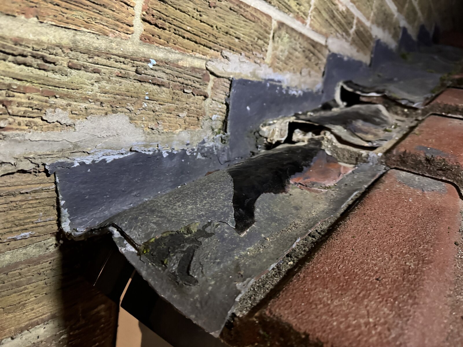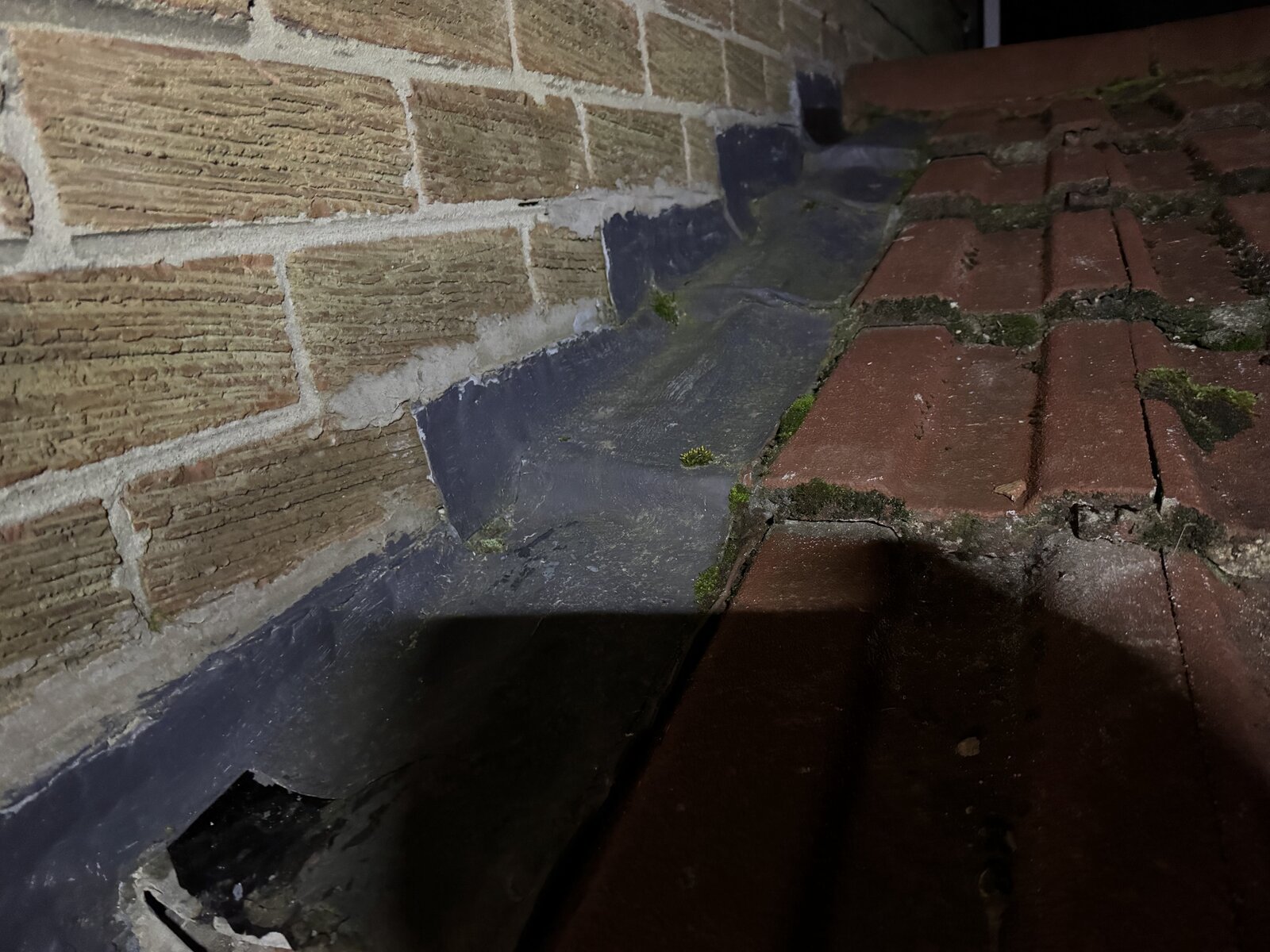 Concentrated in the corner of the ceiling in the extension at this side, the other side is fine. The flashing hasn’t been done very well at all, and is covered with quite a few layers of flashband, which doesn’t hide the fact that the flashing doesn’t underlap the next tile (the other side seems to have been done better).