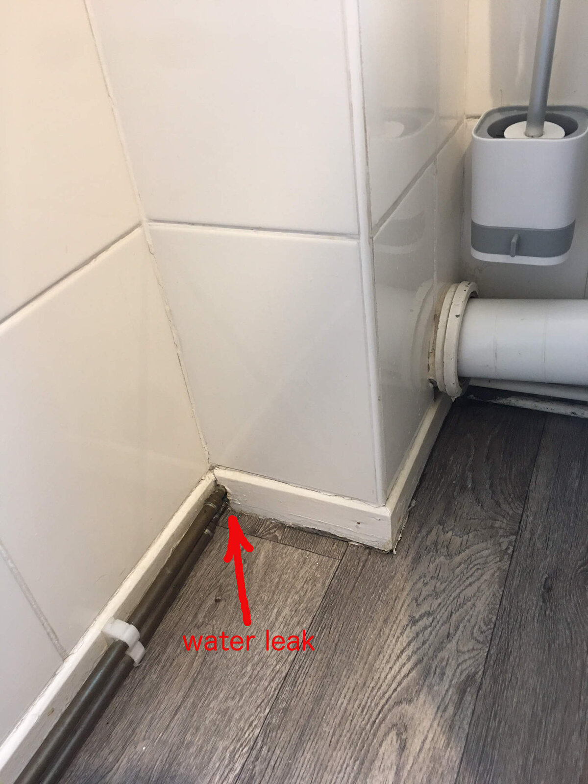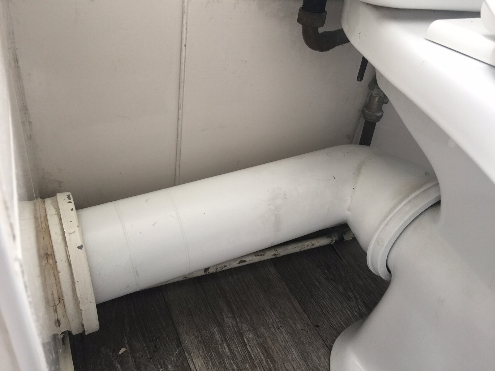 I have a leak as in photo, the leak is coming from that hole, I cannot see any water coming down from the end of the pan connector. Do I have to rip the wall to see whats happening or I can remove the pan connector and do something... Is it worthy buying a small bullet camera to see inside before I damage the wall? It is a bungalow built in 1976. I get conflicting ideas that it might be cast iron inside or it is not and it is plastic. Any suggestions of the problem?