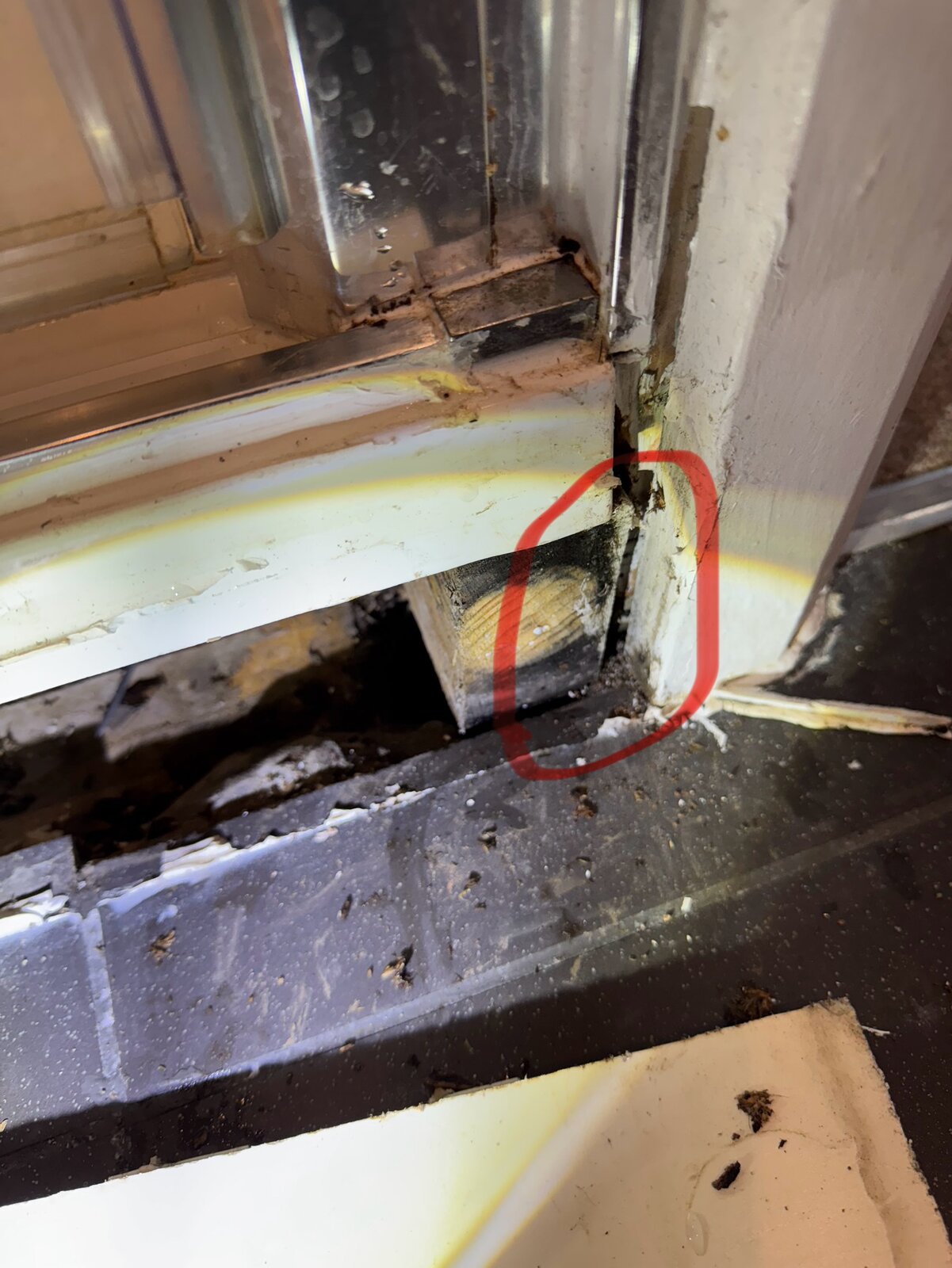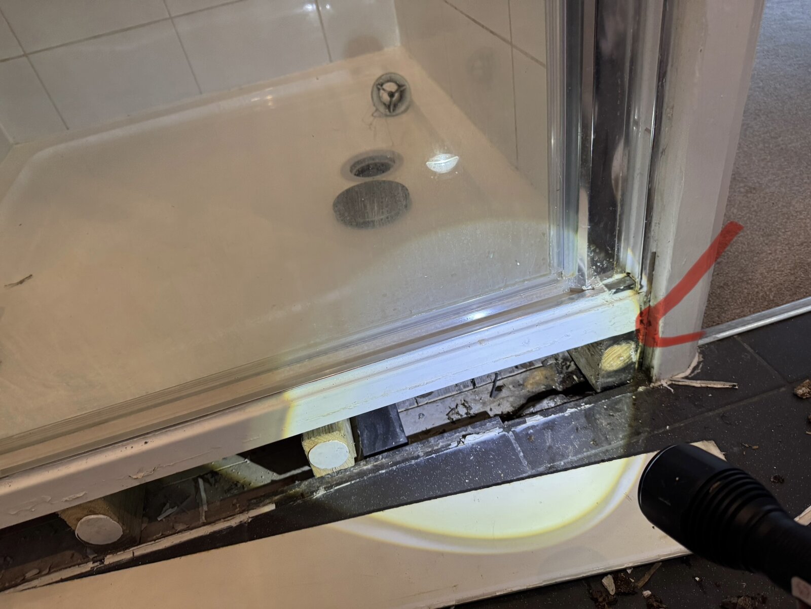 We have a risen shower tray and I noticed a small ceiling stain below. I ripped open pkastic fascia board to see and I believe it’s in front of shower tray where I have marked red.