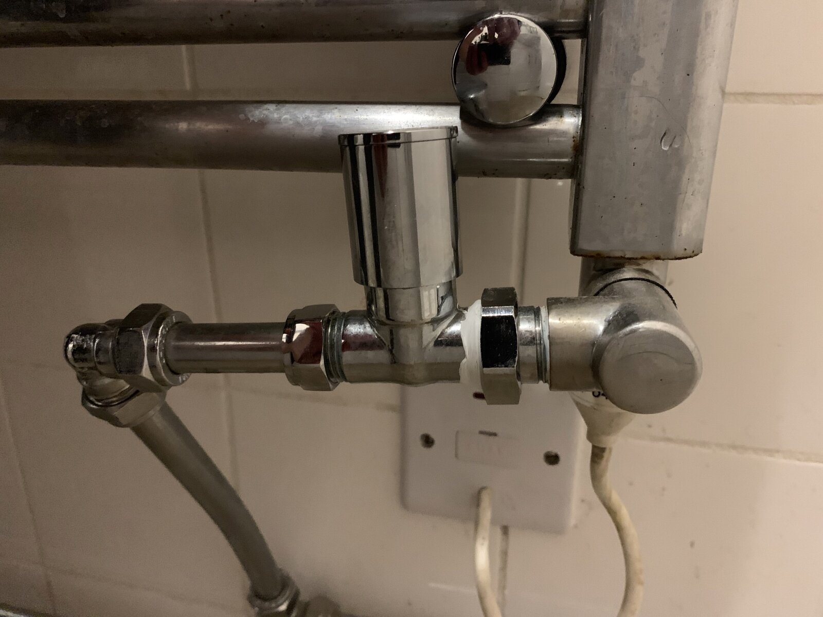 Instead of just coming straight into the radiator, the central heating pipe goes past the connector, then comes up at a right angle, does another right angle into a straight radiator valve, a radiator tail, then female to male radiator towel rail elbow.