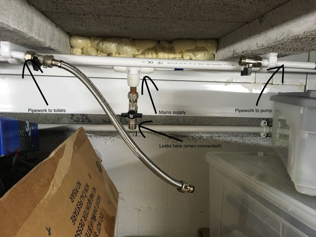 I have a rainwater harvesting system supplying water to the washing machine and toilets. Recently the pump (in the tank) has started misbehaving so I needed to switch the system across to using mains water. To do this, I have a little setup in the basement where a filling loop allows me to disconnect pipework leading to the toilets etc. from the incoming rainwater feed and with the use of a filling loop, connect into the mains. I have had to do this a few times when the pump needs servicing, and it has never been a problem. This time however, I cannot get a seal between the valve on the mains supply and the flexible hose. The leak is so rapid it feels as if there's a whole part missing here somewhere - perhaps something that fell off last time I made the switch? If anybody knows what the parts SHOULD look like, and therefore what is missing, I would be very grateful. I should add that I can quite happily connect the hose back onto the pump pipework with no leaks at all, so the problem seems to be with the valve on the mains supply. The water is leaking out (fast) around the thread connector, not the valve handle.