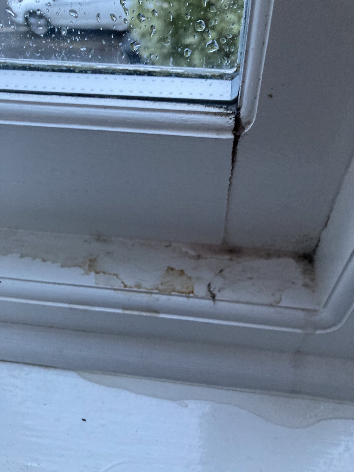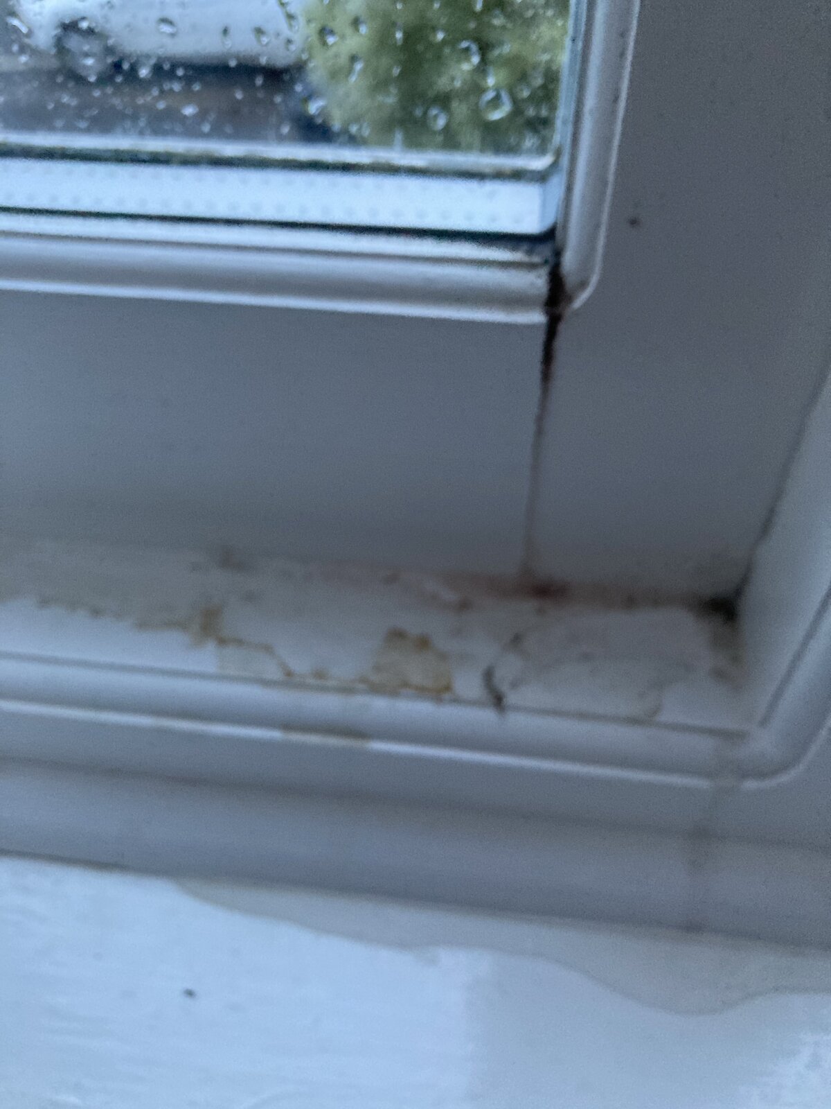 Hello - some help would be very welcome . Noticed the windows leaking in all rooms since we moved in. New windows installed in 2016 (no warranty or fensa) . Heavy rain does it but most times little pools below glass or on frame. No misting or condensation ever. Not happening on the windows that open . Photos attached. Can see some cracks in paint at various places …. Any views welcome and appreciated