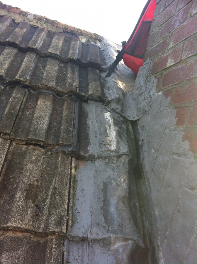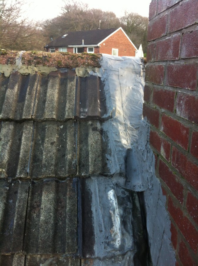 Hi all, as stated I've got a leaking roof. We had a roofer (cowboy) refurb our semi top dorma roof. They took off the ridge tiles, roof tiles above the fibreglassed flat roof then re battened, re feltetd and then put the roof and ridge tiles back. Well all I can say is what a bodge. The ridge tiles were just dumped back ontop and badly pointed, the chimney lead was painted with fiber glass and the tiles were all crooked. Anyway after a few months i noticed a water mark appear about the center light fitting. I stuck my head in the loft and looked between the joints and could see a drip coming from a gap in the flat roof roofing boards. We had a the flat roof fibreglasses about 8 months ago and the roofer used 600 wait glass matting and it seemed like a good solid job but it does pool a lot of water. My main question is, could the fibreglass split and crack in this small amount of time and could be leaking water onto the old felt roof beneath and then leak through this or could water be leaking from the badly painted ridge tiles or chimney lead work ?? I've got some pics to upload which will give you a laugh !!